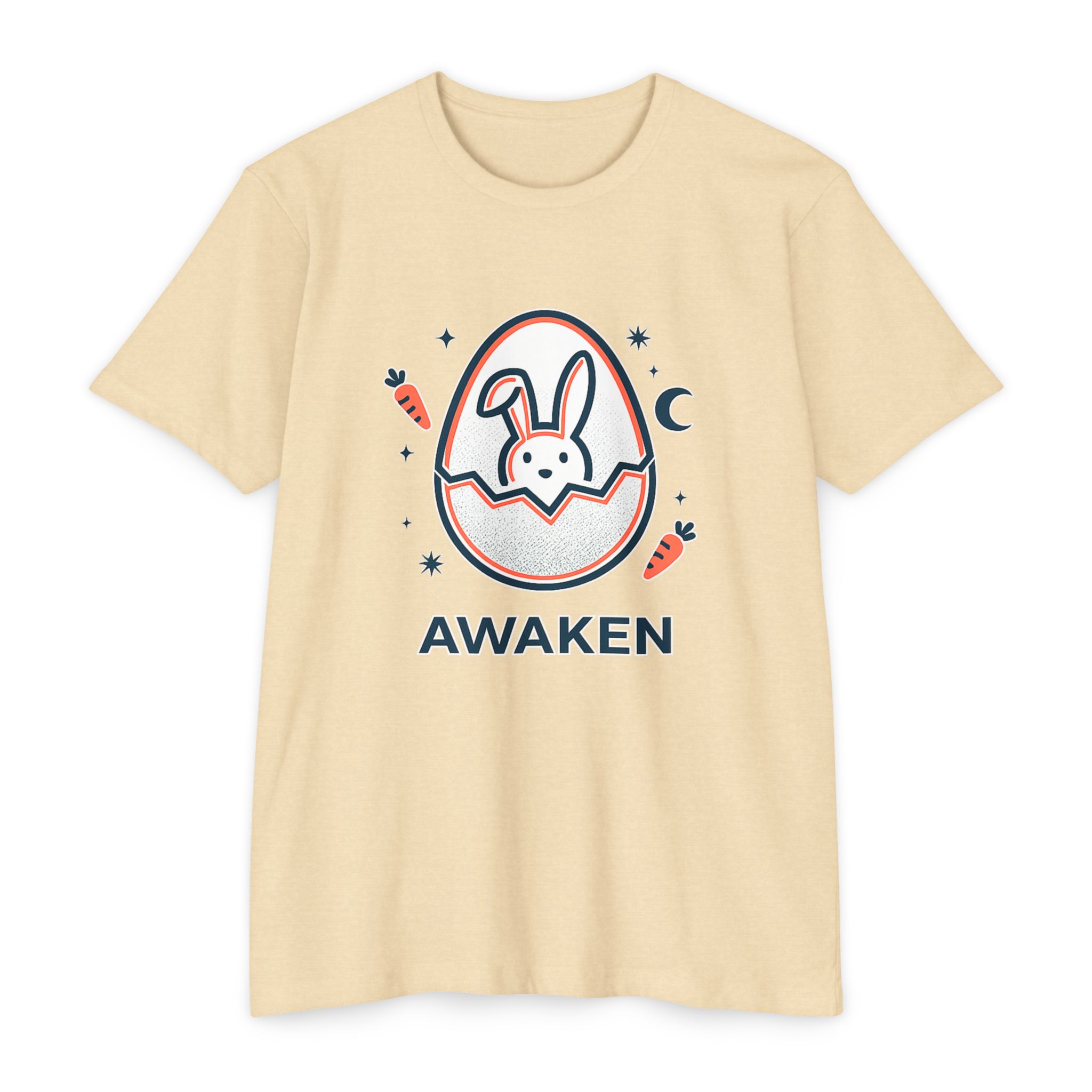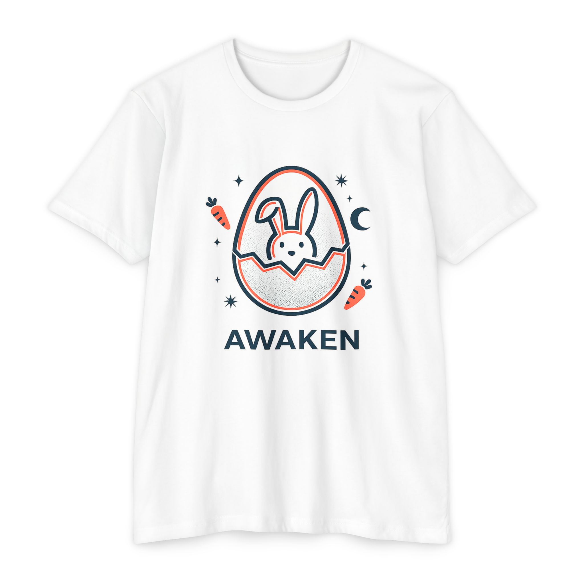 Lightweight and easygoing, this tee carries a quiet, playful energy — a hand-drawn bunny cracking out of an egg with little carrots and a crescent moon above, and the single word: AWAKEN. It feels like the first slow morning stretch after a long winter: soft fabric that sits comfortably against the skin, a classic fit that layers under jackets or stands alone, and a clean, minimal design that speaks to gentle renewal. Wear it on early walks, casual meetups, or during slow creative mornings when you want a small, whimsical reminder to rise and begin again.