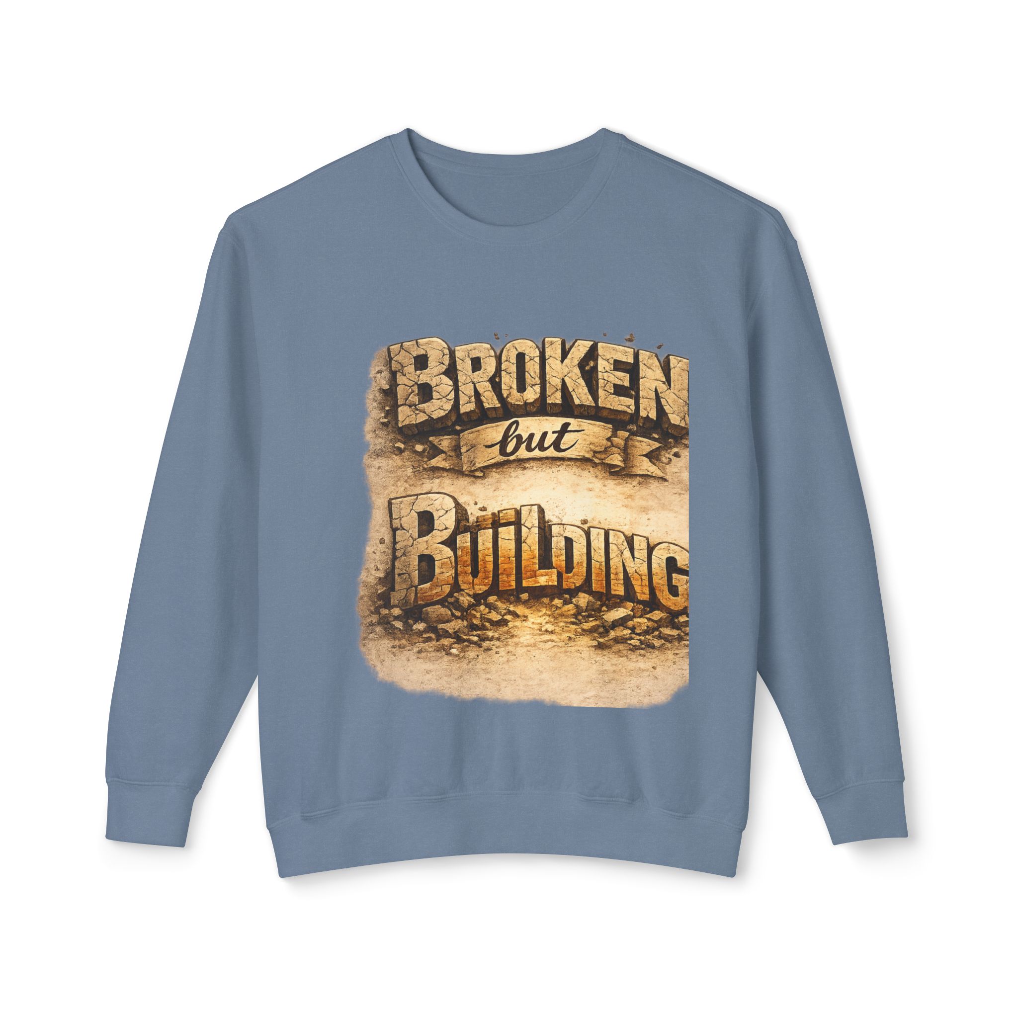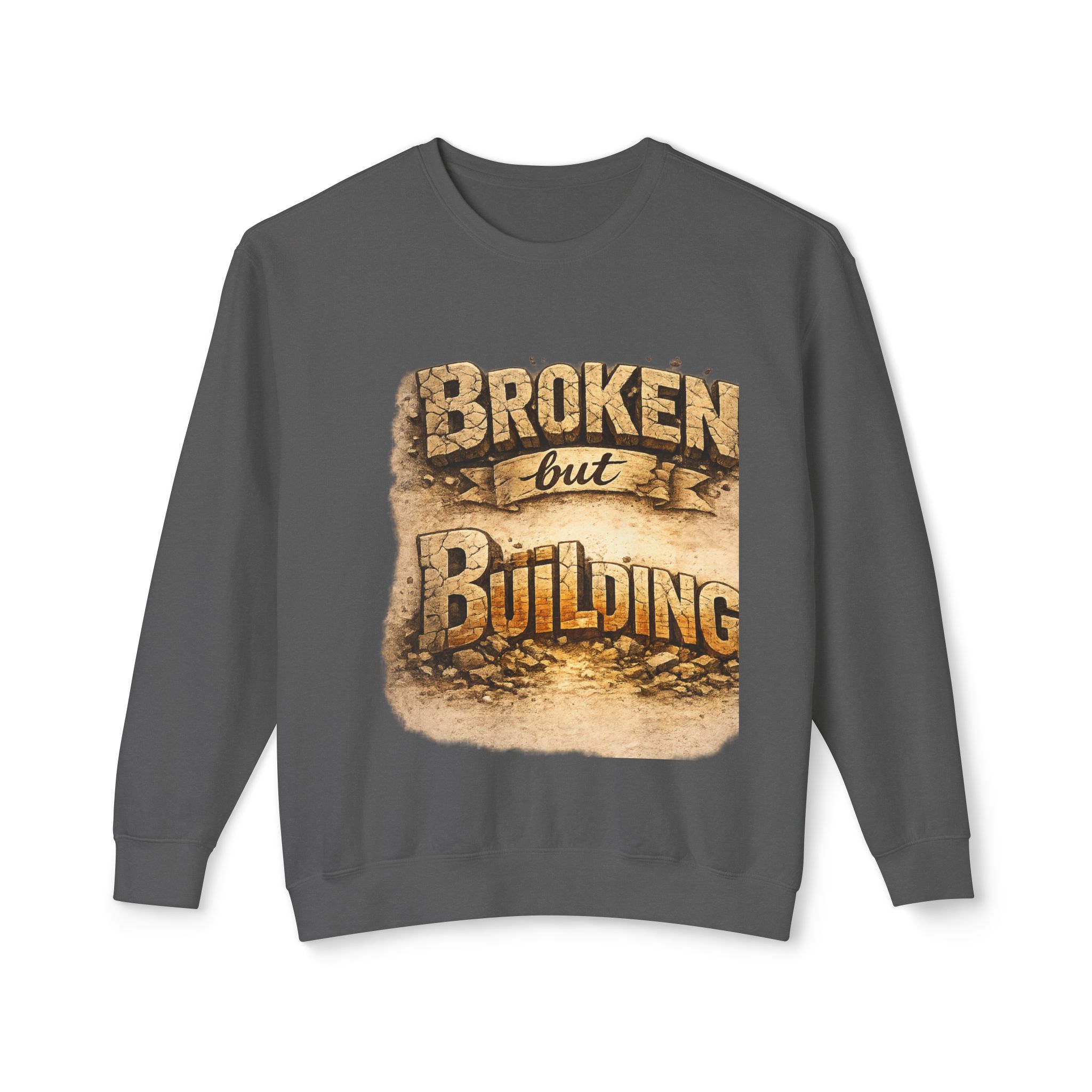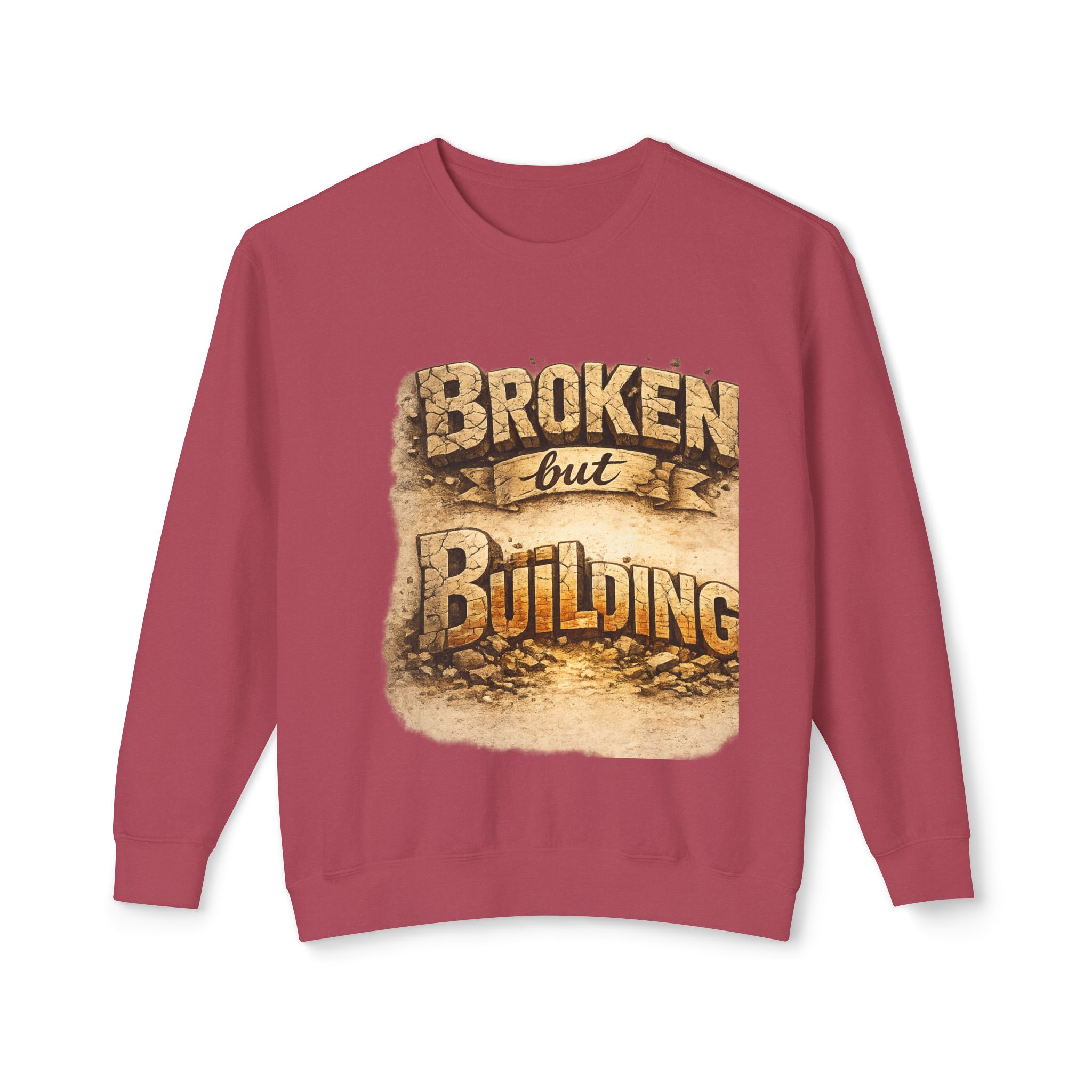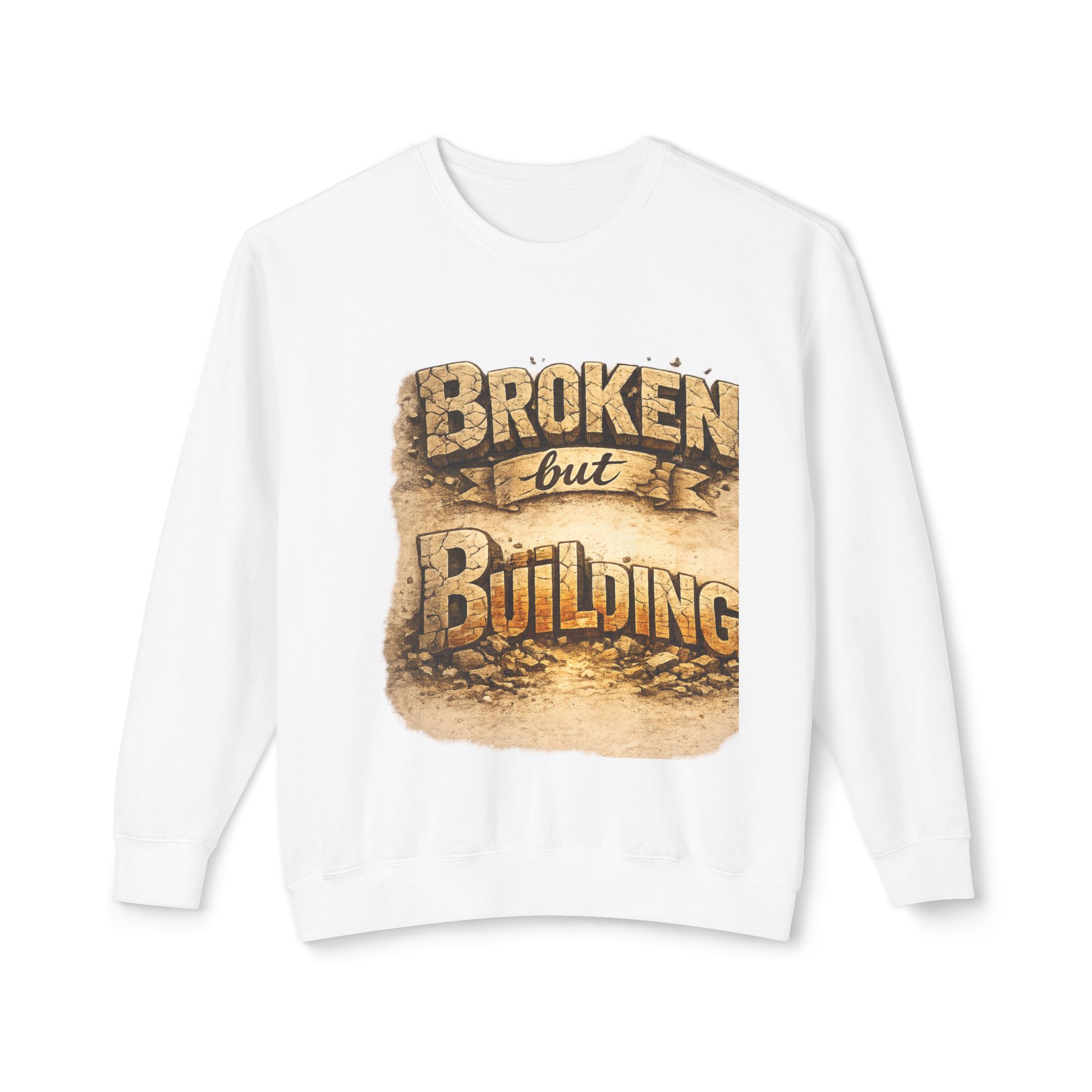 Lightweight and quietly bold, this crewneck carries a weathered, hopeful message — “Broken but Building” printed in warm, earthy tones that feel like late-afternoon light on reclaimed wood. The relaxed fit and soft, ring-spun cotton make it an easy layer for days when you want comfort without losing intention. Wear it at a low-key meet-up, a community repair night, or while sketching plans for the next project. The subtle distressing in the print and classic crew silhouette speak to hands-on makers, resilient creatives, and anyone rebuilding after setbacks. It sits comfortably over a tee or under a jacket, blending into everyday routines while quietly telling a story of steady recovery and craft.