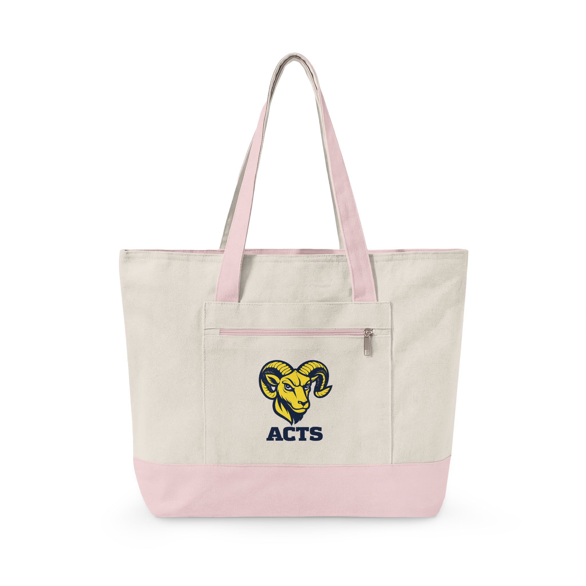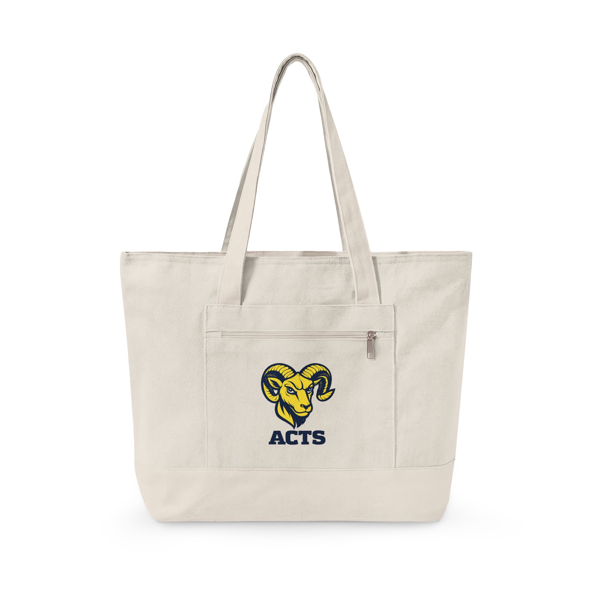 This heavy-duty zippered canvas tote brings rugged utility with a touch of spirit. Made from 12 oz. cotton canvas, it feels sturdy yet familiar—ready for library runs, weekend markets, or hauling practice gear. The wide, zip-closed main compartment keeps books, a laptop sleeve, or gym clothes contained and protected, while the front zip pocket gives instant access to keys, cards, or a phone. Long self-fabric handles sit comfortably over the shoulder, and the roomy 19-liter capacity handles whatever your day hands you. A bold embroidered ram emblem on the front pocket adds character and school- or team-pride without shouting—this is a tote that works as hard as you do and represents where you belong.