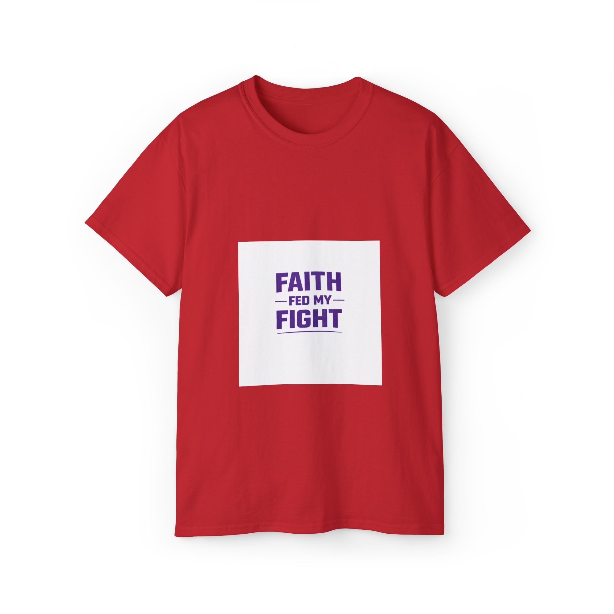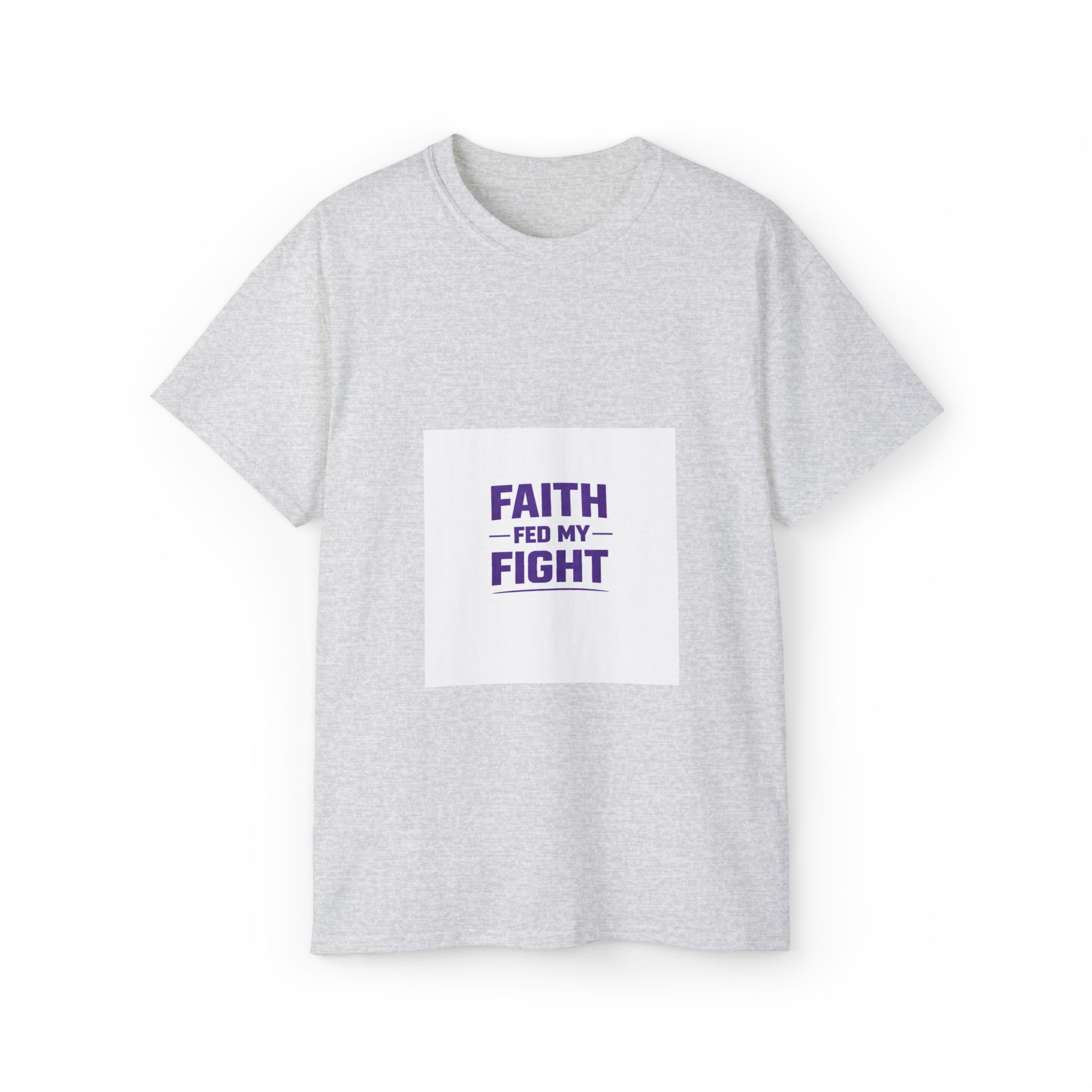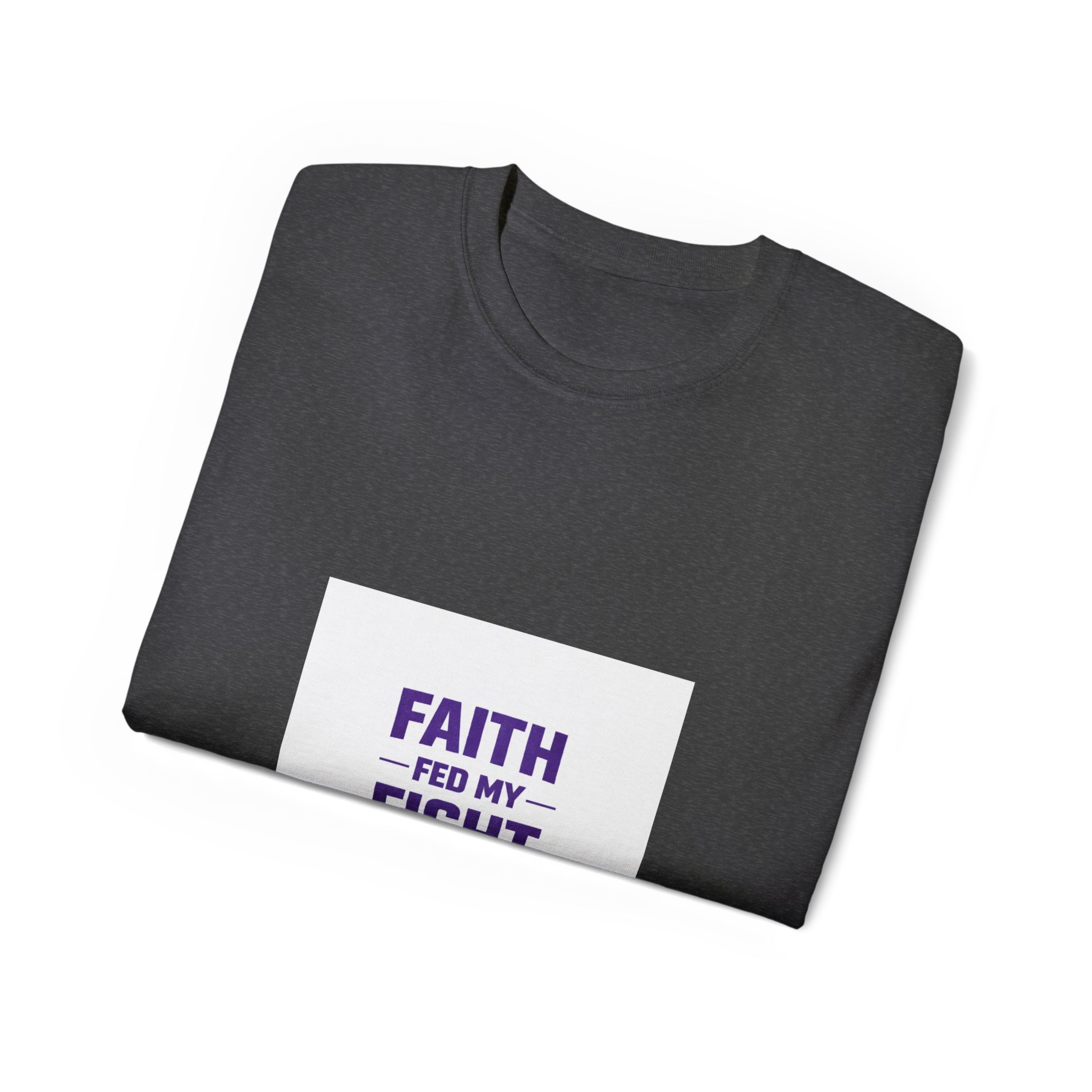 This shirt says Faith Fed My Fight with a white background. It’s printed on a unisex ultra cotton tee is a classic. Quality cotton construction means that designs are sure to shine. The shoulders are tapped for a good upper-body fit. There are no side seams, ensuring a clean, unbroken flow. The collar has ribbed knitting for improved elasticity. The materials that went into this product are sustainably sourced and economically friendly.