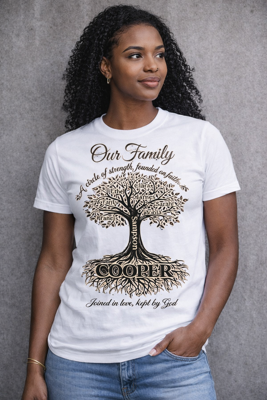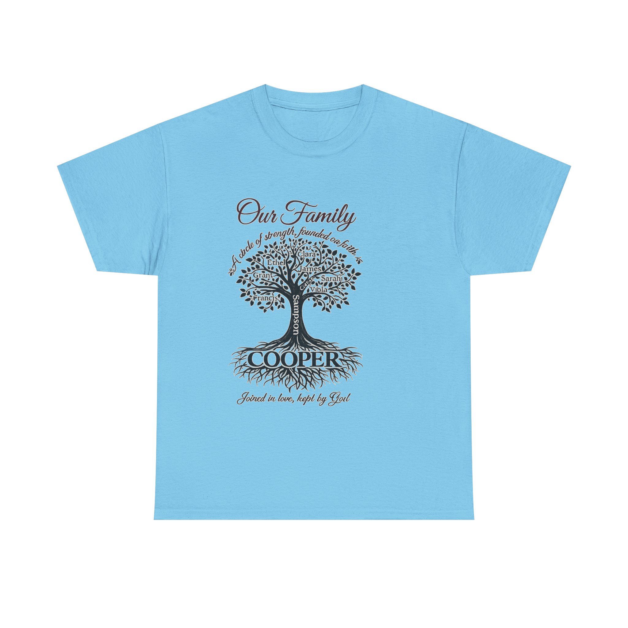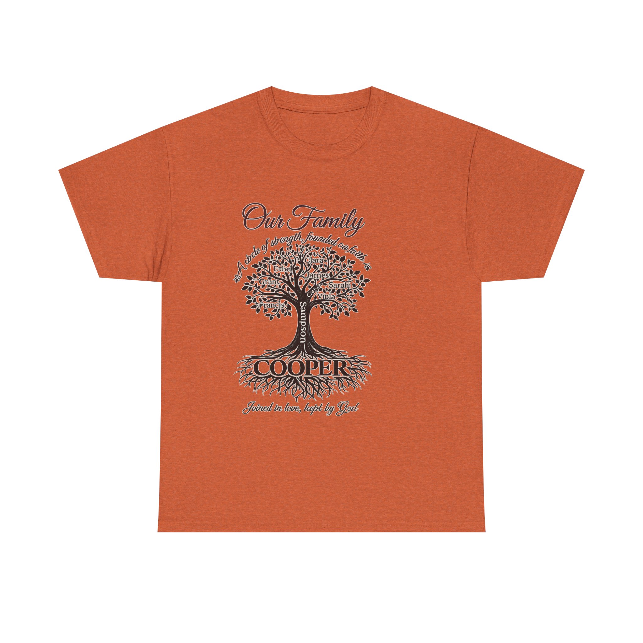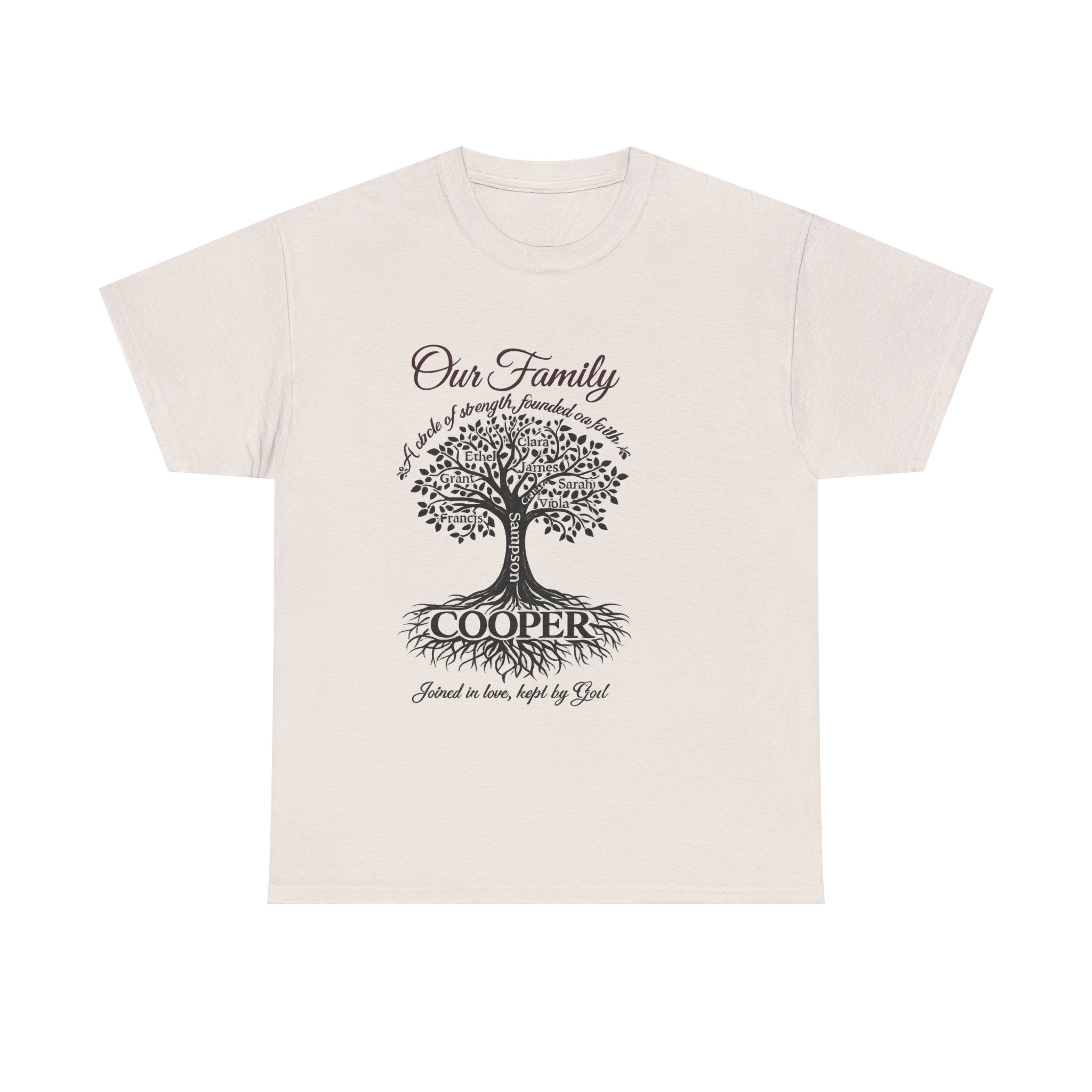 This classic family tree tee carries a gentle, heartfelt presence — a soft white cotton canvas with an elegant tree illustration, surnamed across the roots. It feels like an heirloom: calm, familiar, and made to wear to casual family gatherings, reunions, or Sunday visits. The artwork is detailed and delicate, readable from a short distance, and the shirt’s breathable medium-weight cotton keeps the mood relaxed whether you’re sharing stories on the porch or arranging old photos around the kitchen table. The overall effect is warm and personal — a quiet way to wear your family name and the memories it holds.