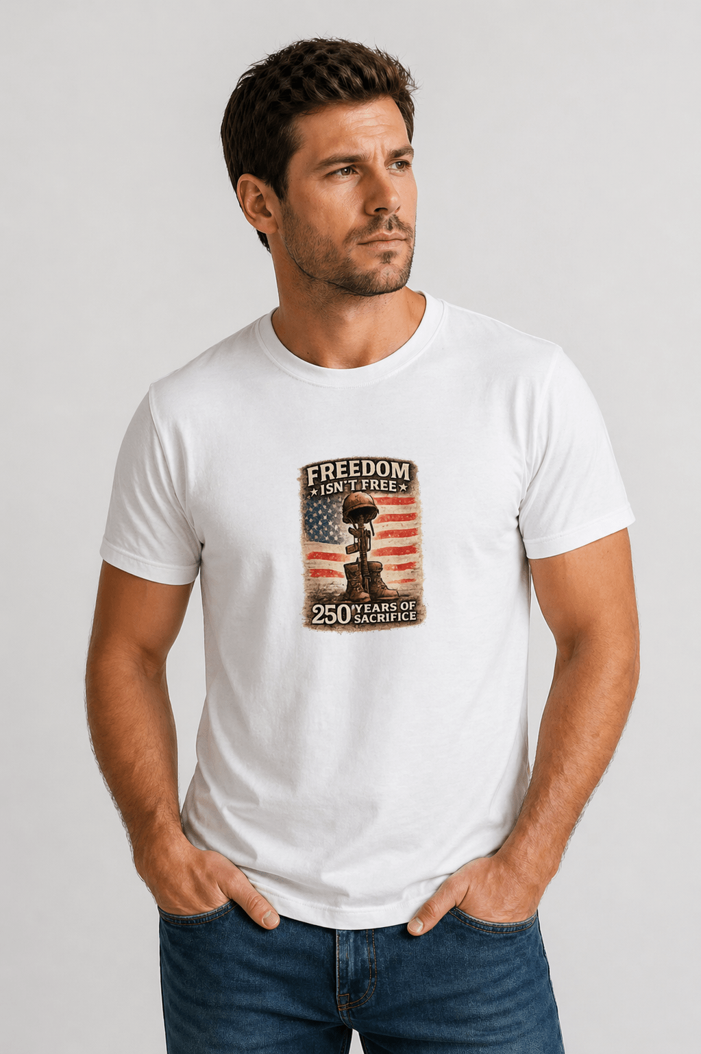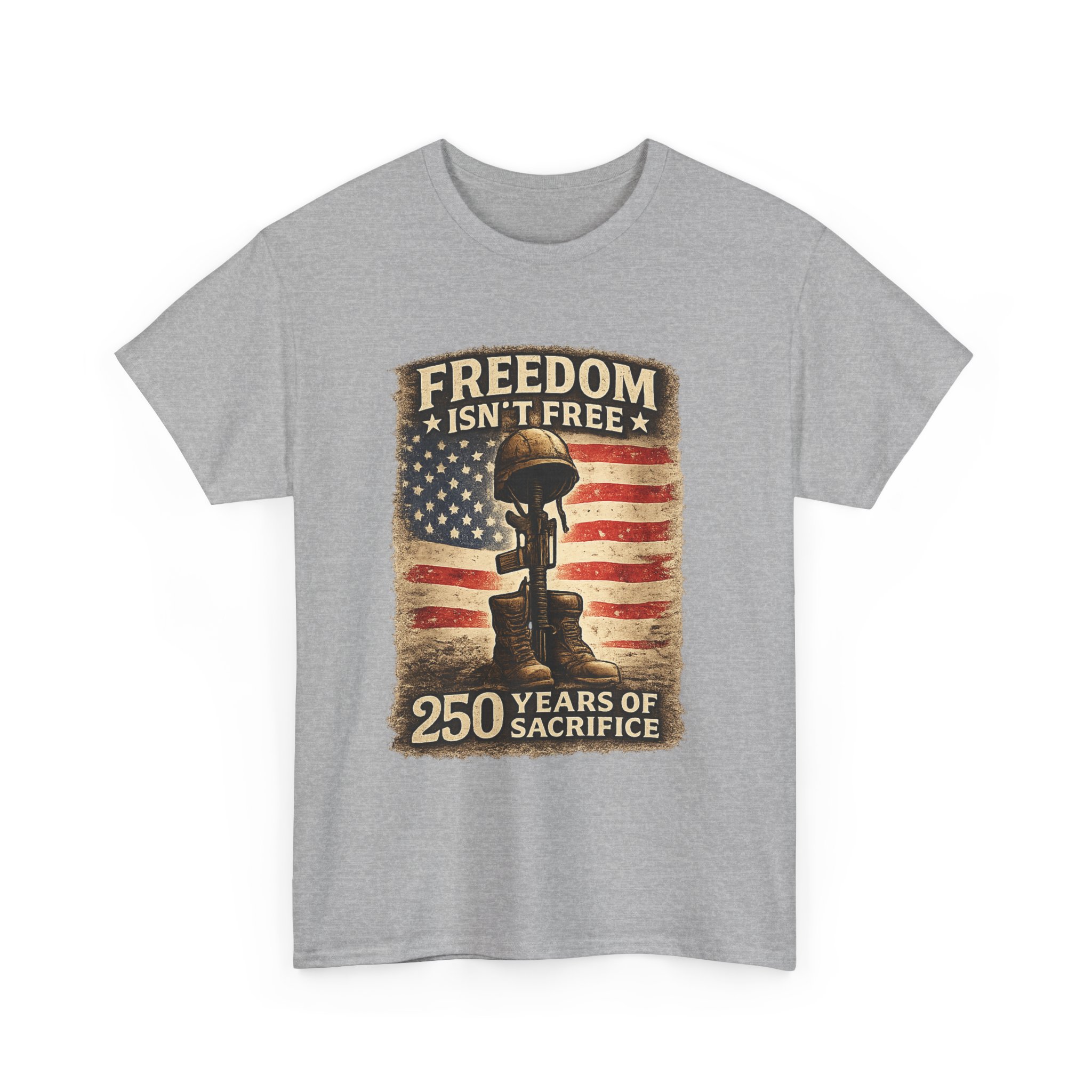 A bold, patriotic tribute tee featuring a distressed American flag and a fallen soldier memorial design. The message “Freedom Isn’t Free – 250 Years of Sacrifice” honors the courage and sacrifice of those who have served, making it a meaningful statement piece rooted in history, pride, and remembrance. This white classic tee carries a quiet, powerful message: an aged American flag backdrop frames a battlefield memorial silhouette with the words “Freedom Isn’t Free” and “250 Years of Sacrifice.” The worn, vintage print feels like a veteran’s patch of memory — weathered but proud. It sits naturally on a relaxed crew neck, blending into everyday wear while speaking to remembrance and respect. Comfortable enough for long summer days, this shirt settles into routines like weekend barbecues, memorial ceremonies, or quiet moments at a roadside memorial. It’s for people who carry history with them — veterans, military families, patriots, and community members who honor service with understated dignity.