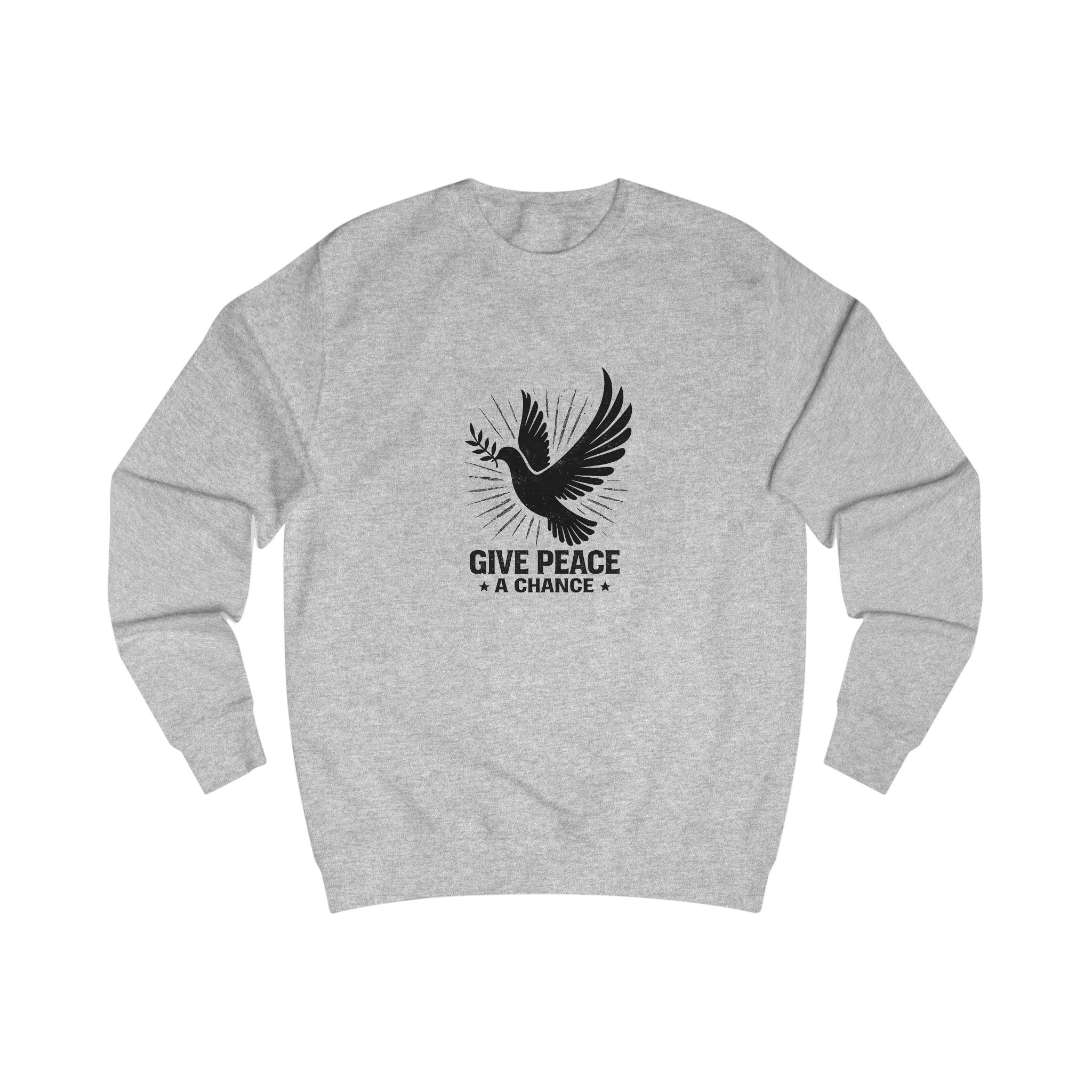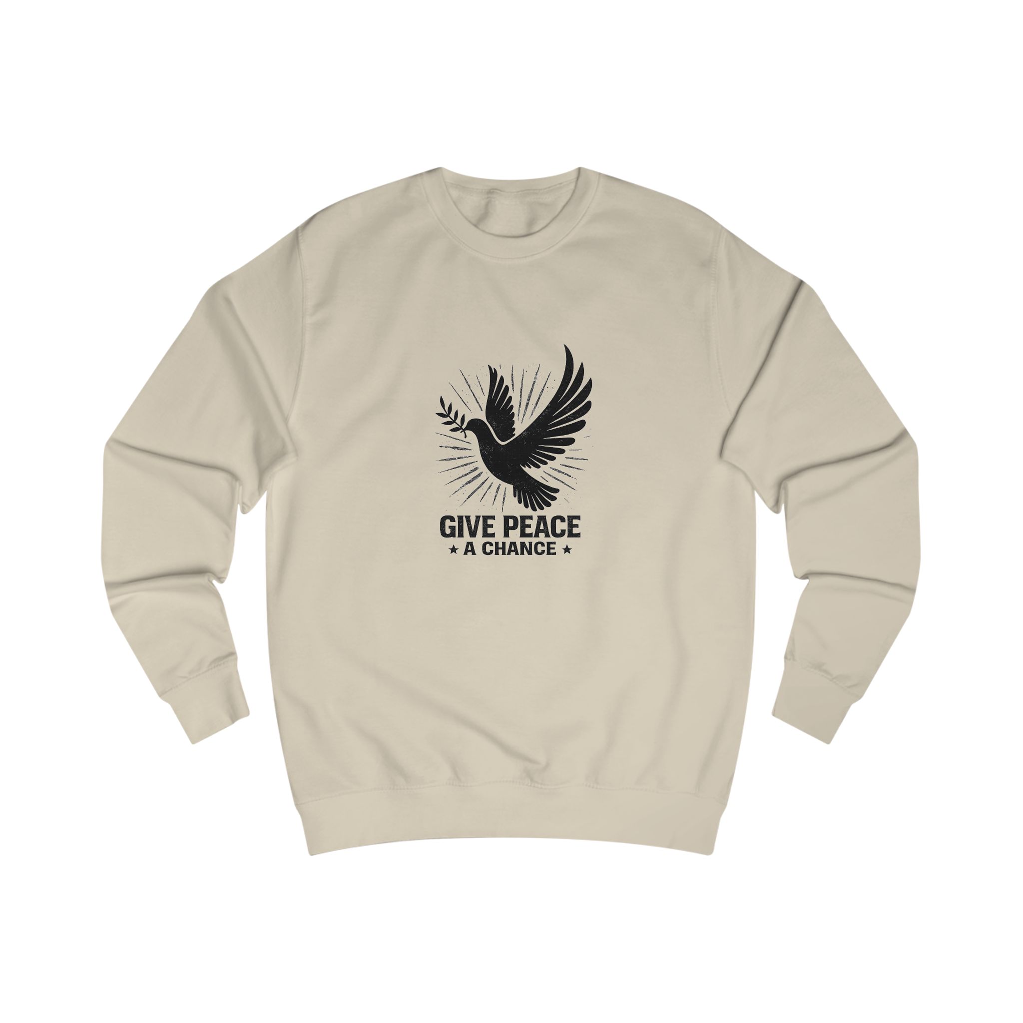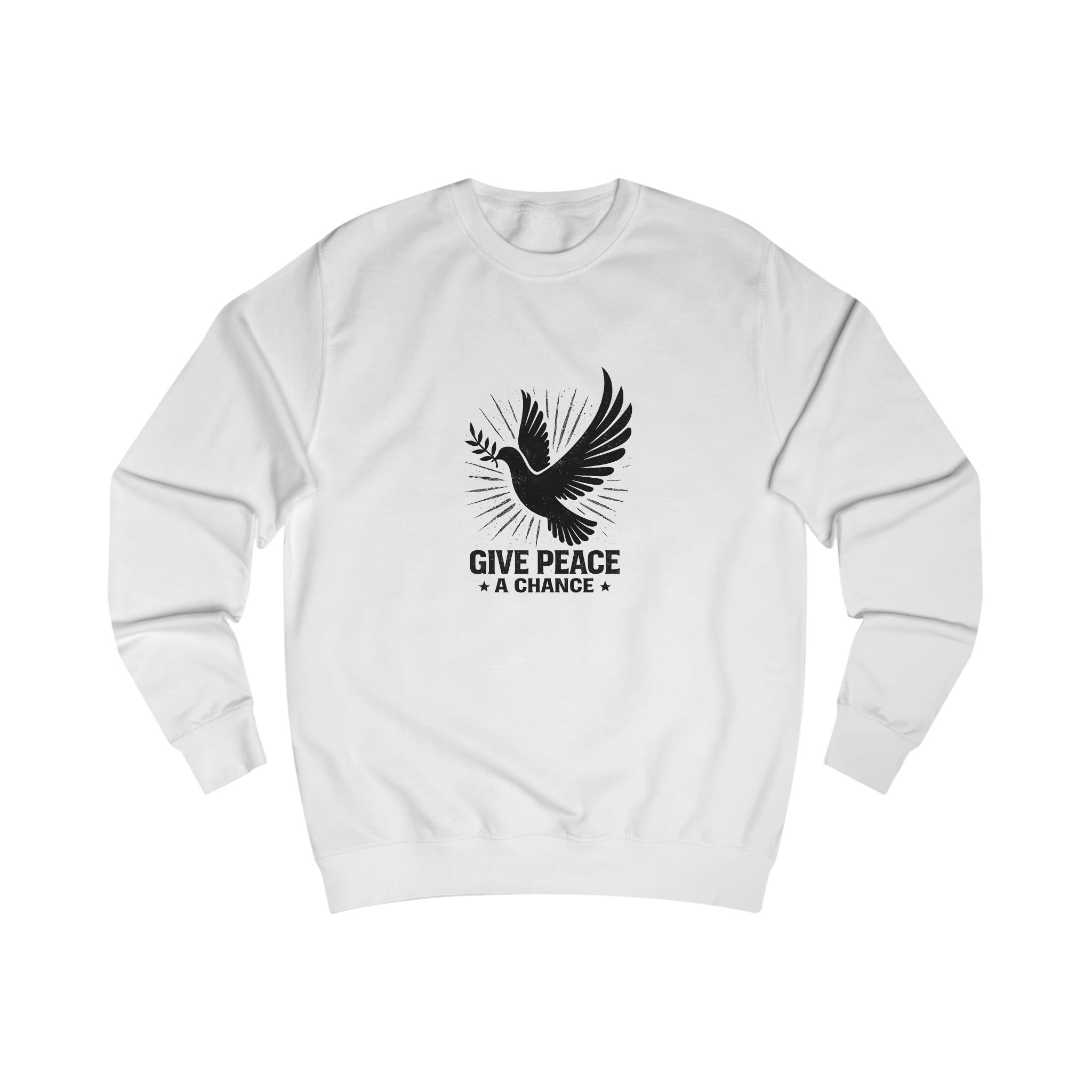 This cozy sweatshirt carries a simple, bold message: gentle strength in a graphic dove and the words “Give Peace a Chance.” It feels like wrapping yourself in calm — a medium-heavy fabric that holds its shape, a soft ribbed collar and cuffs, and a clean, structured silhouette that layers easily. Wear it while you wander city streets, head to a rally, or settle in for a quiet evening. The understated black-on-white design speaks quietly but confidently, blending into everyday life while sharing a hopeful, human message.
