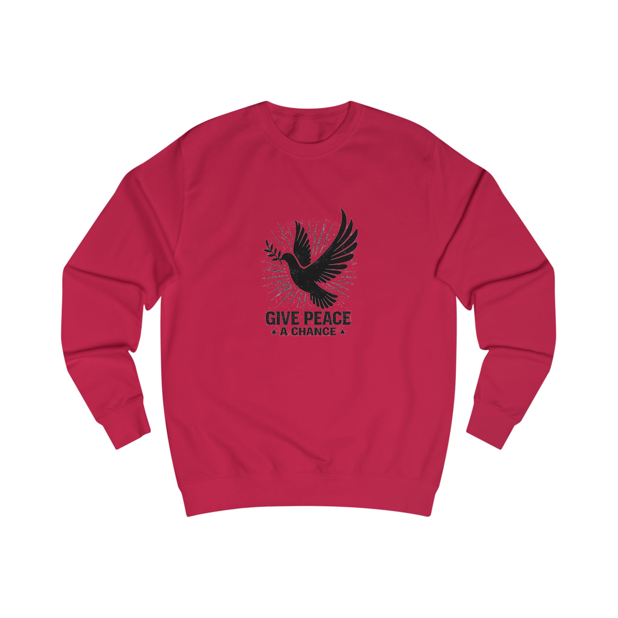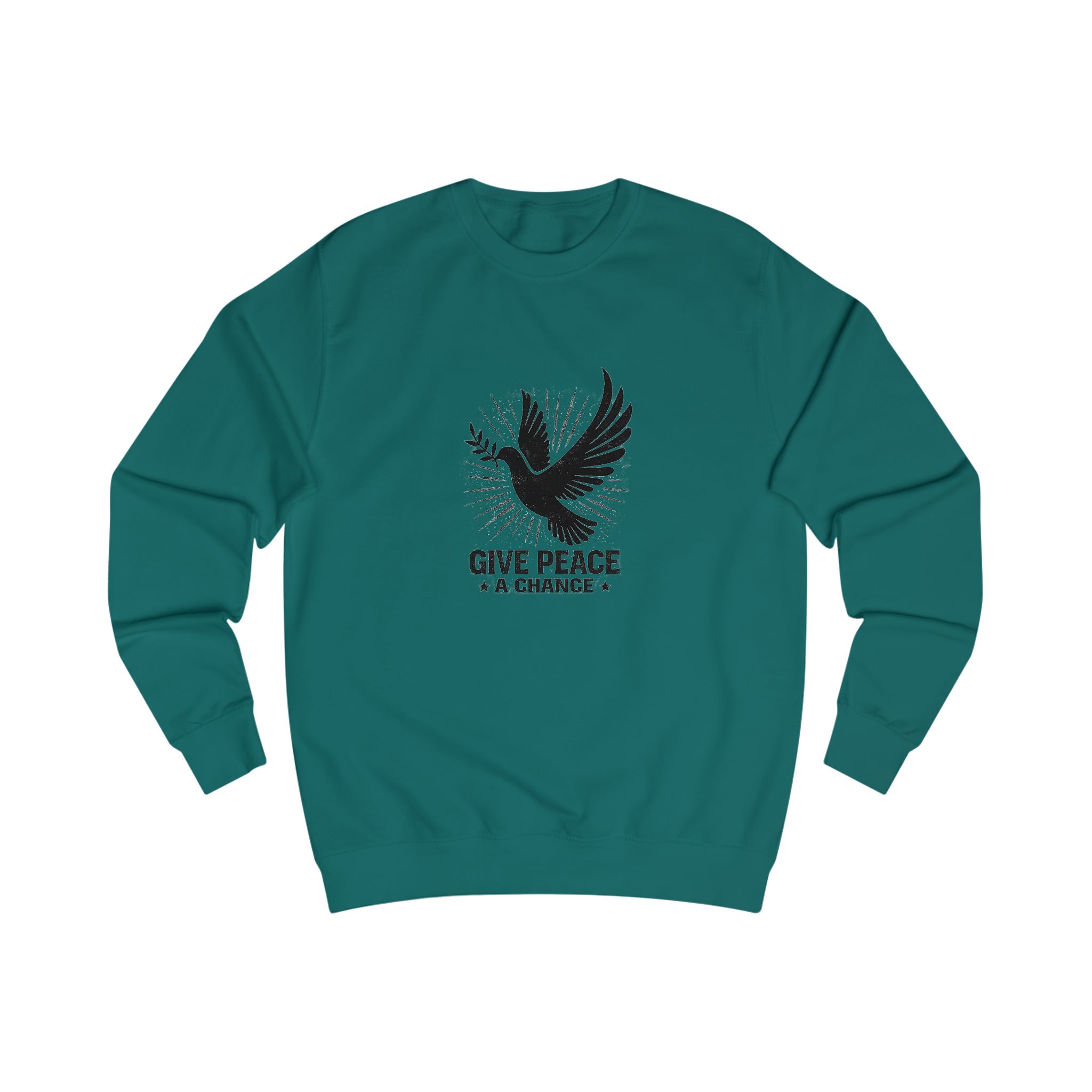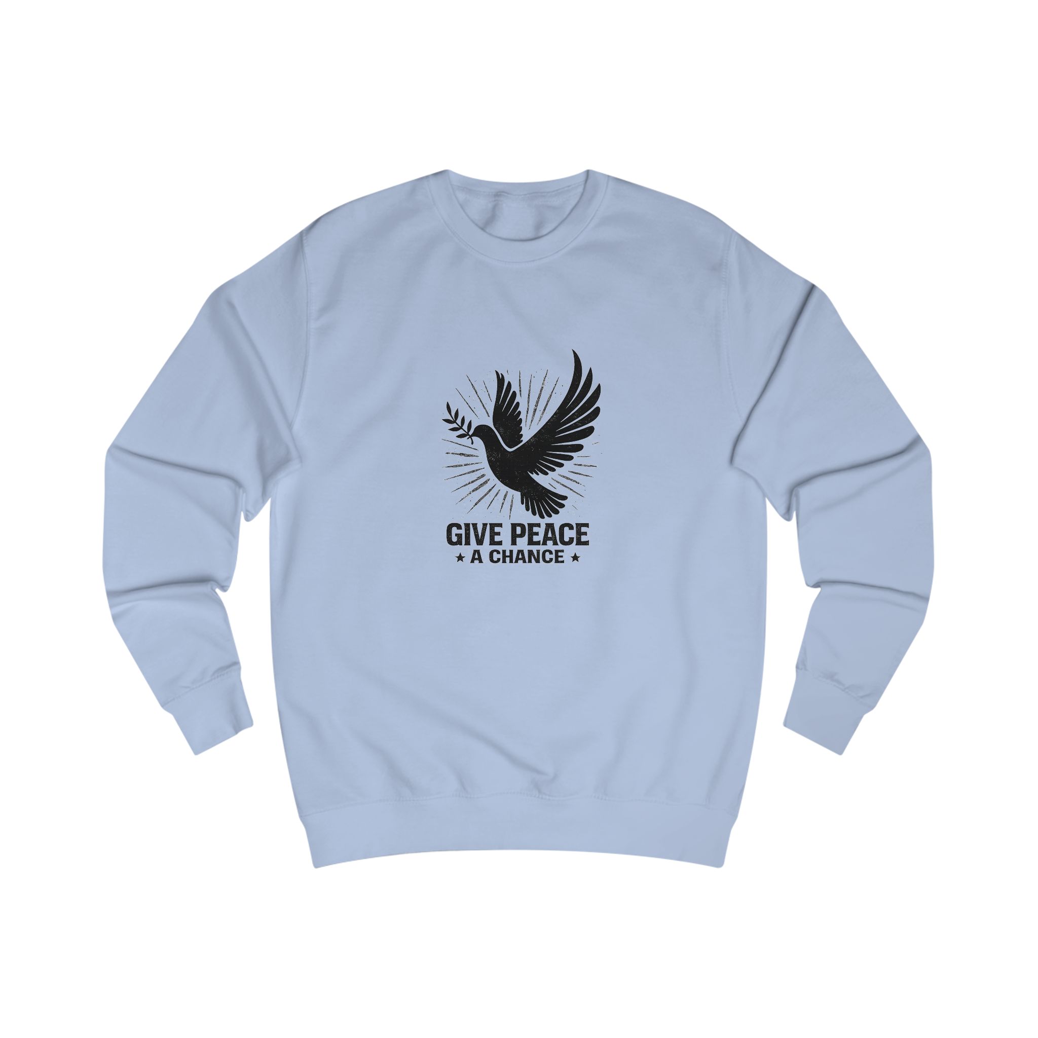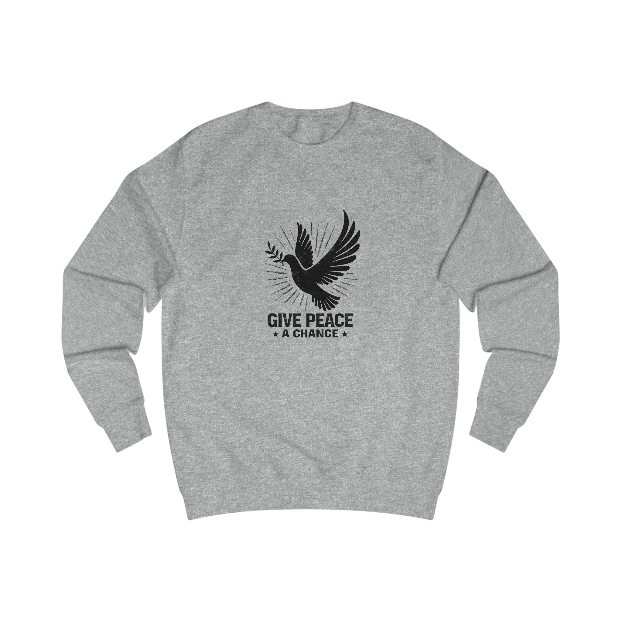 This cozy sweatshirt carries a simple, bold message: gentle strength in a graphic dove and the words “Give Peace a Chance.” It feels like wrapping yourself in calm — a medium-heavy fabric that holds its shape, a soft ribbed collar and cuffs, and a clean, structured silhouette that layers easily. Wear it while you wander city streets, head to a rally, or settle in for a quiet evening. The understated black-on-white design speaks quietly but confidently, blending into everyday life while sharing a hopeful, human message.