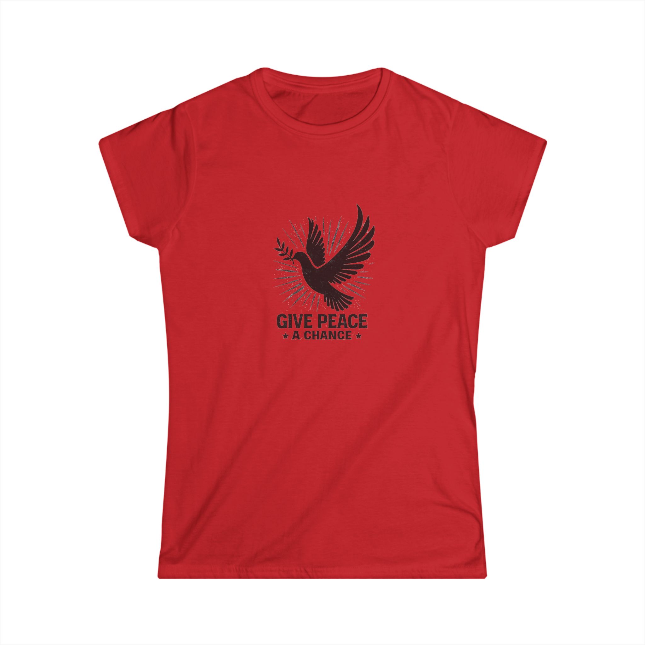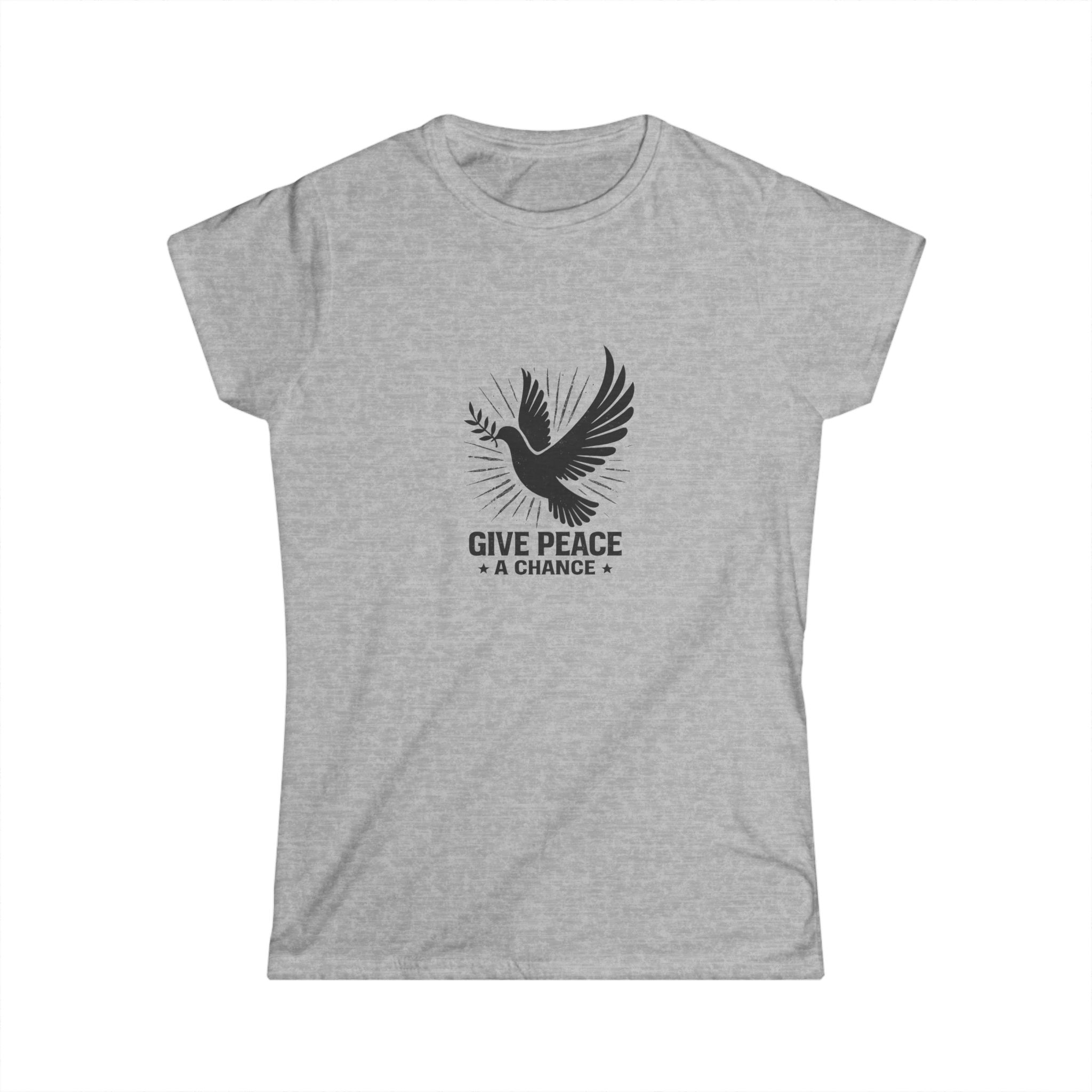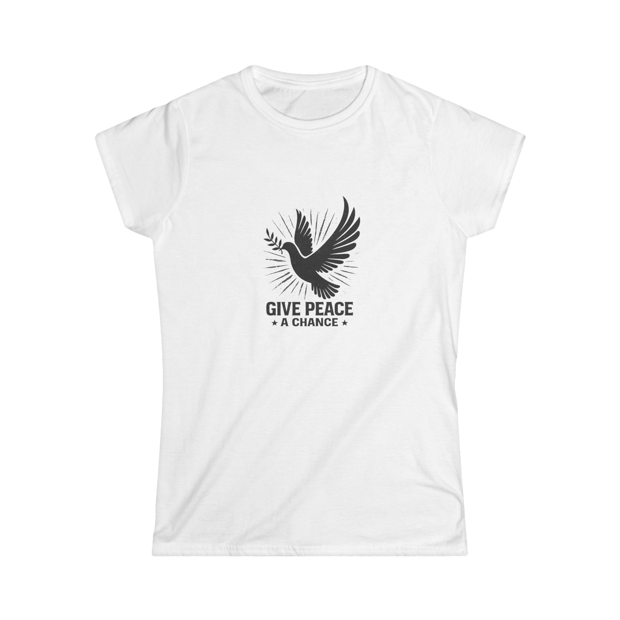 Light and hopeful, this softstyle tee carries a simple message: give peace a chance. The dove graphic—wings outstretched, olive sprig in beak—feels like a quiet breath after a noisy day. The semi-fitted cut and lightweight fabric make it an easy layer for rallies, volunteer days, or slow weekend mornings. Wear it to speak gently but clearly: you stand for calm, community, and steady action. The tear-away label and true-to-size fit keep the focus on comfort, while the minimalist black-on-white print pairs cleanly with denim, jumpsuits, or a cozy cardigan.