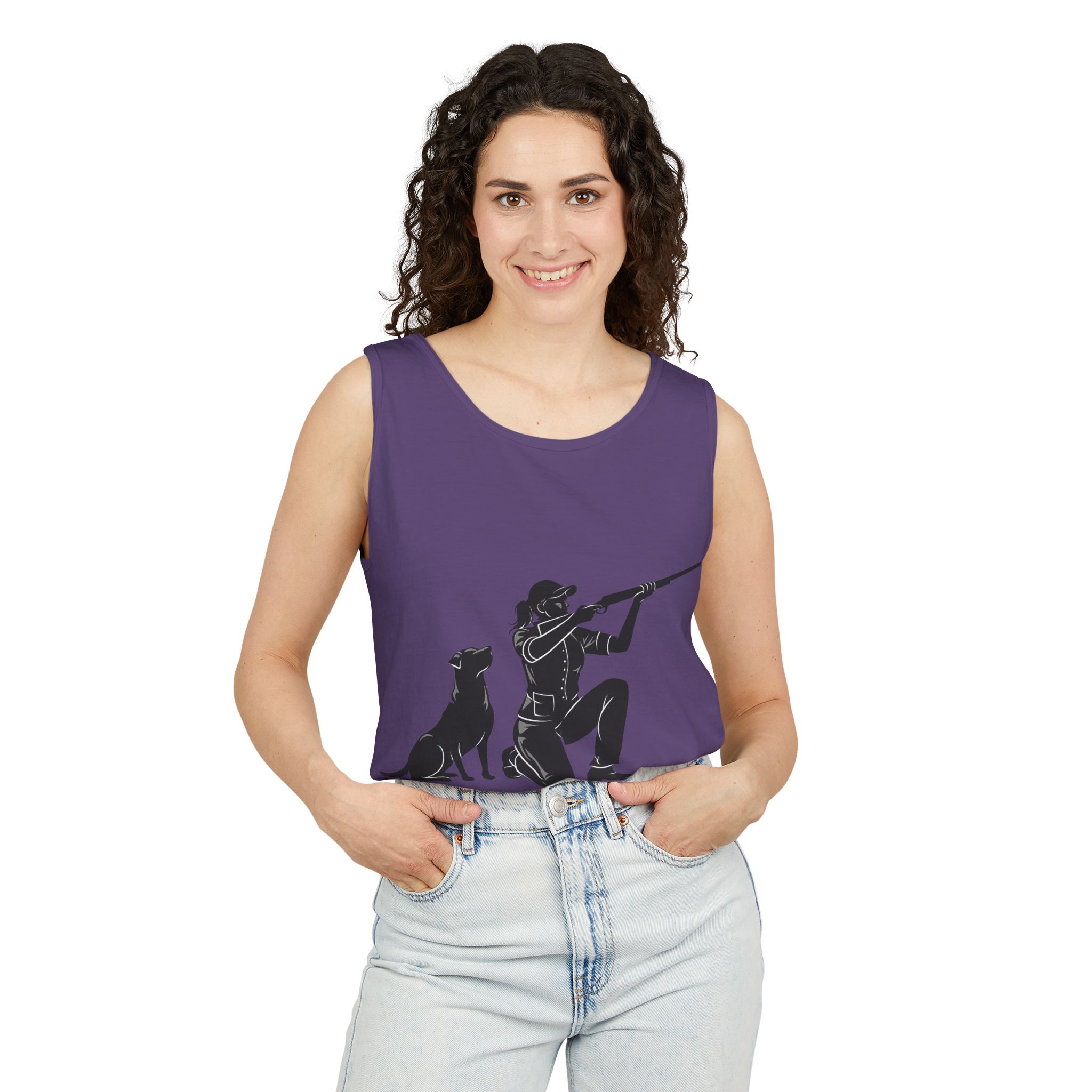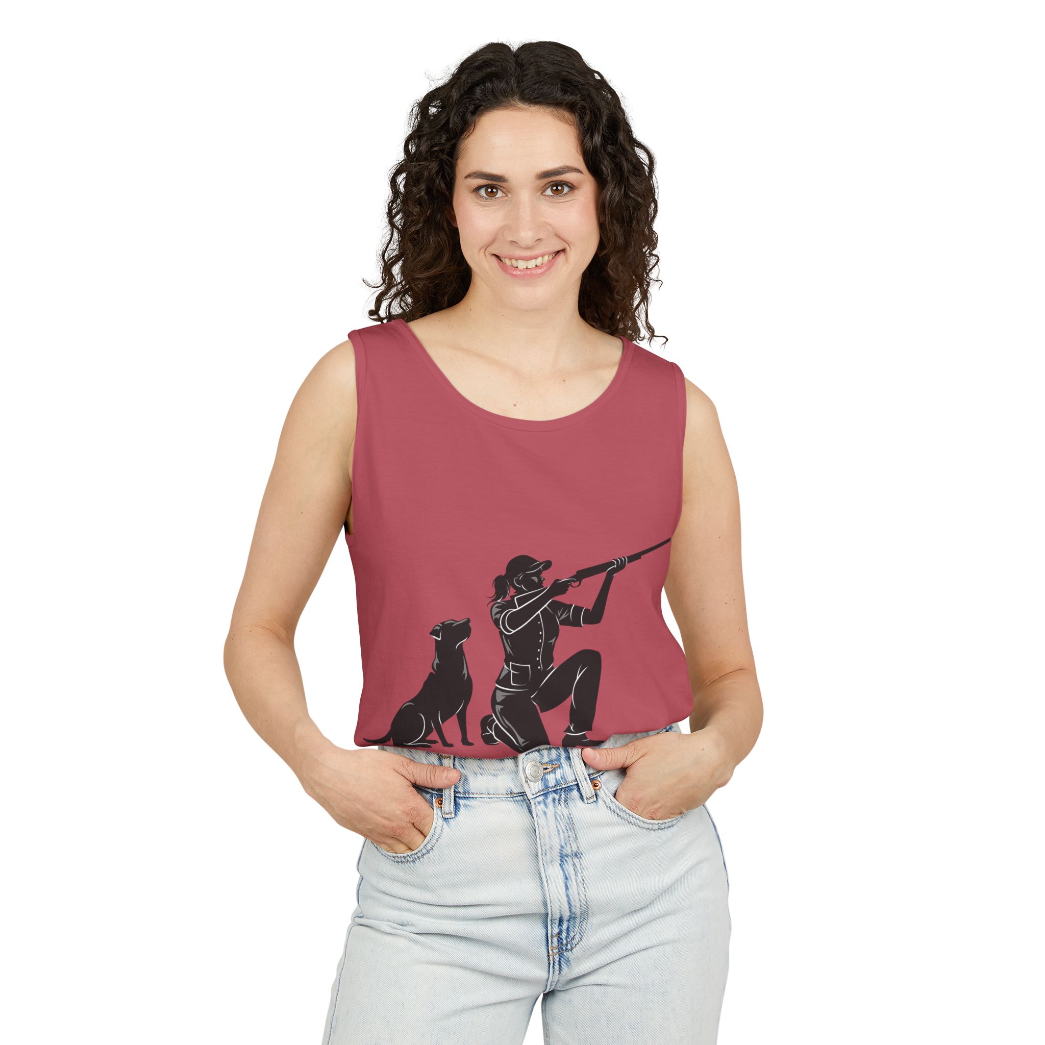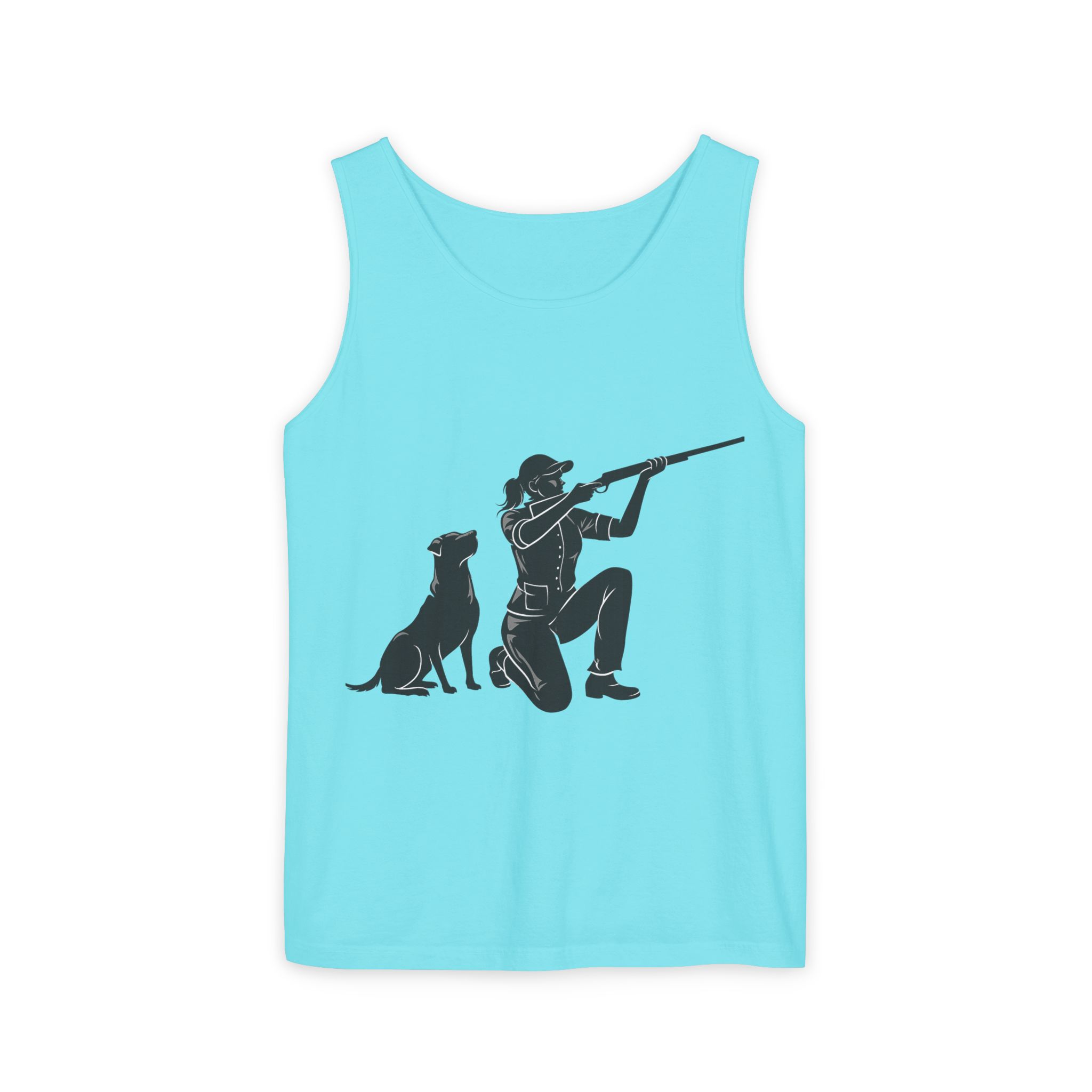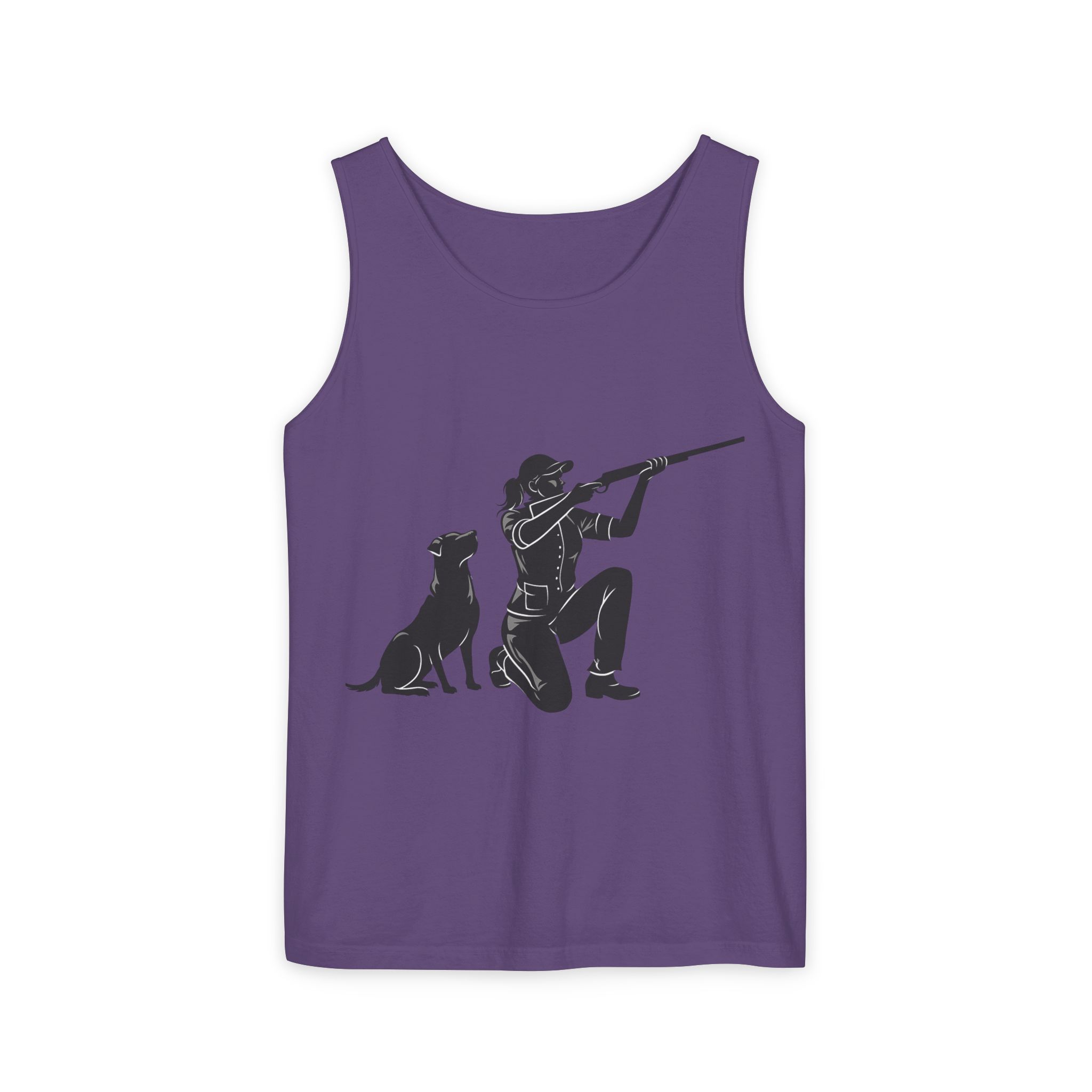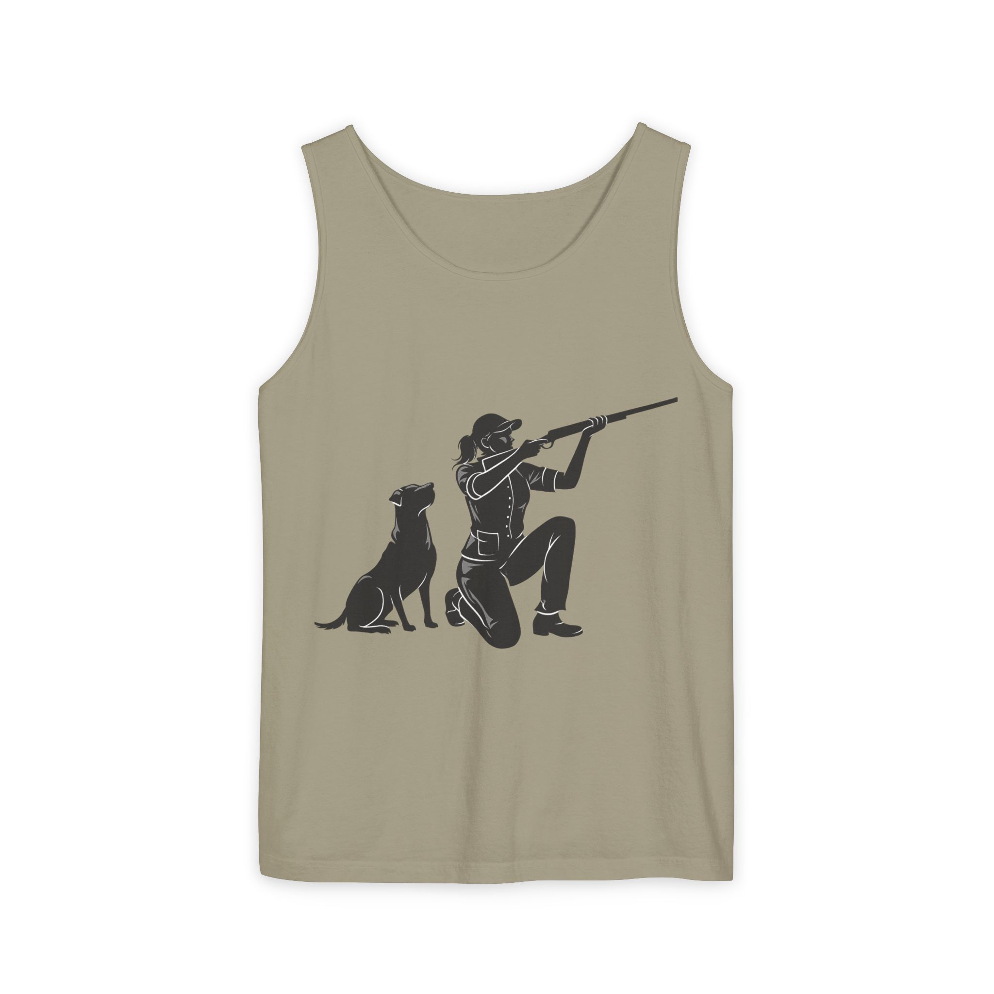 Lightweight, garment-dyed tank with a quiet outdoors vibe. The front print shows a kneeling hunter and a faithful retriever, rendered in a clean silhouette that reads like a shared moment at first light. The soft, worn-in dye and relaxed cut make this tank feel lived-in from the first wear — great for slow mornings on the range, packing into a hunting vest, or layering under a flannel after the hunt. It wears like a companion: simple, durable, and comfortably familiar.