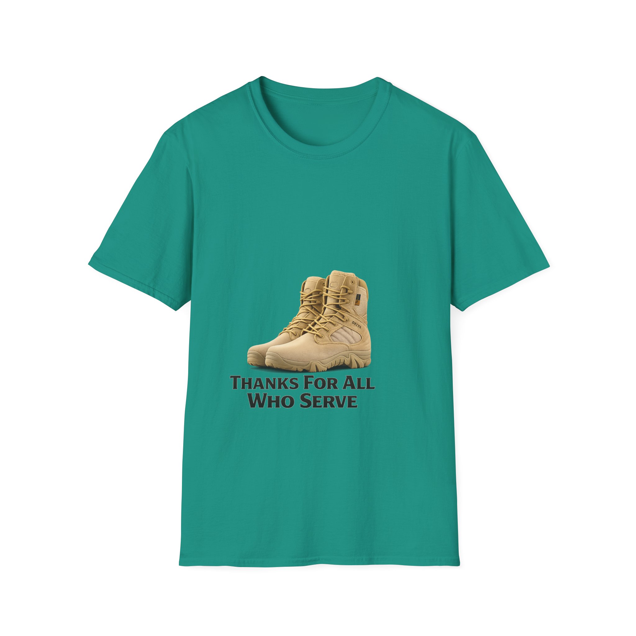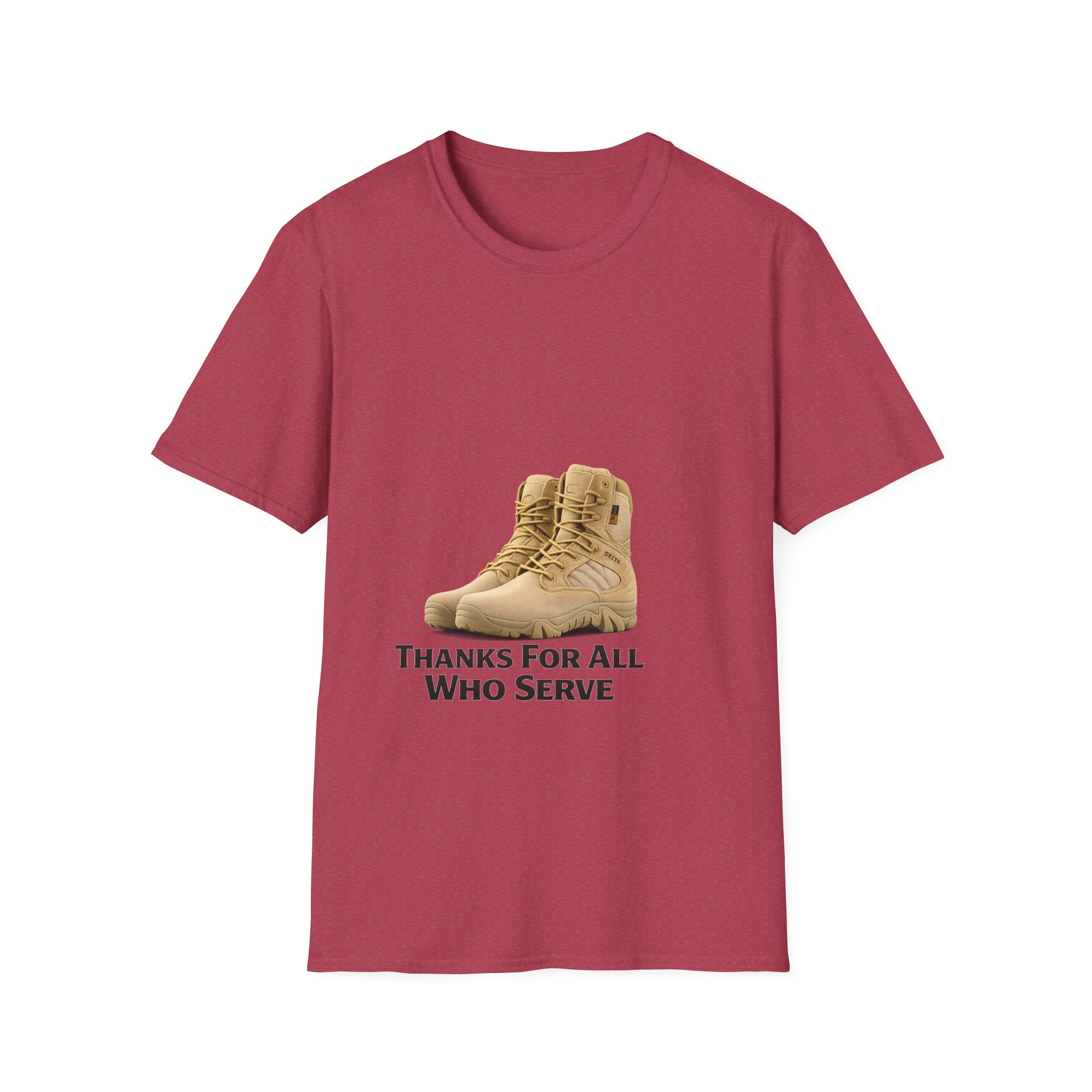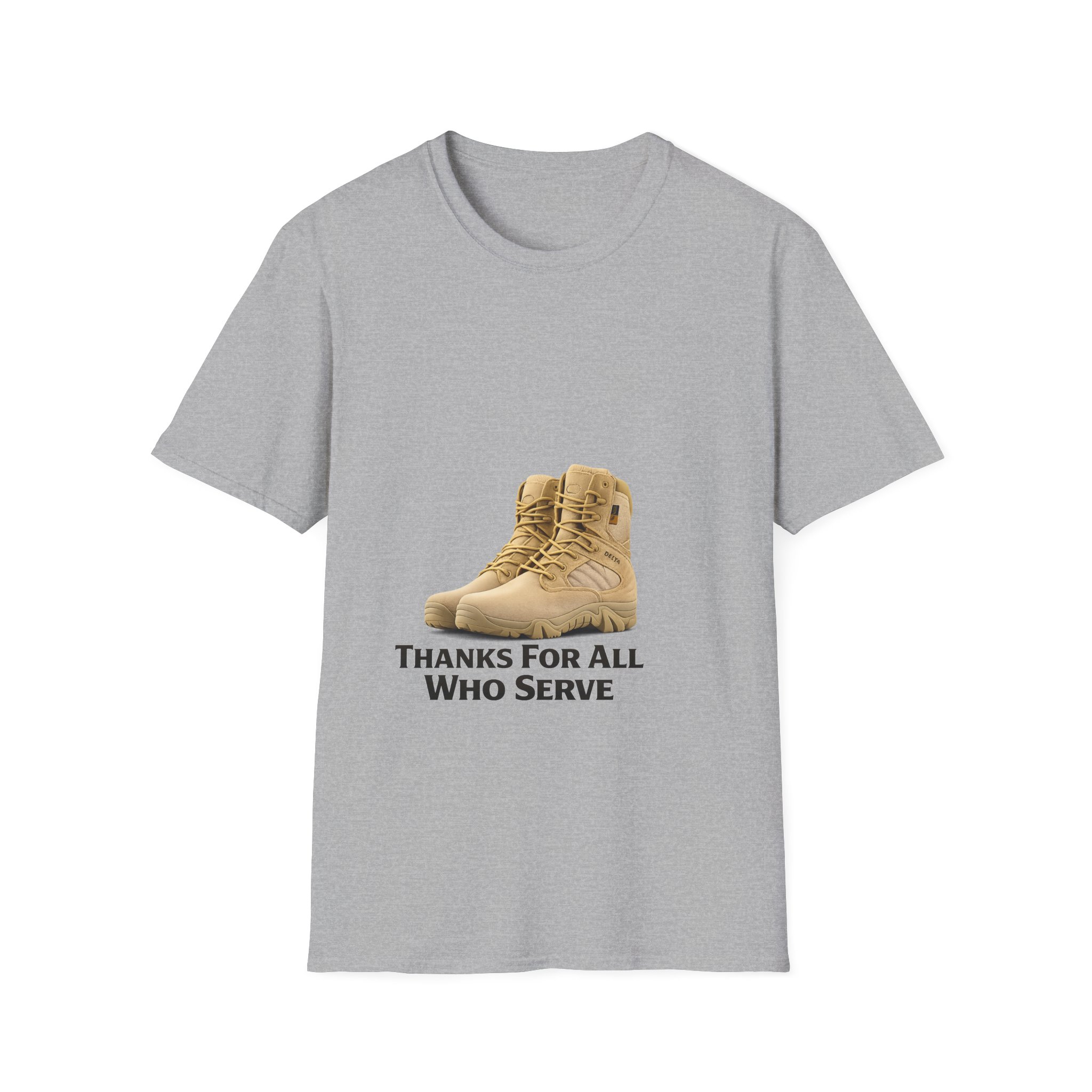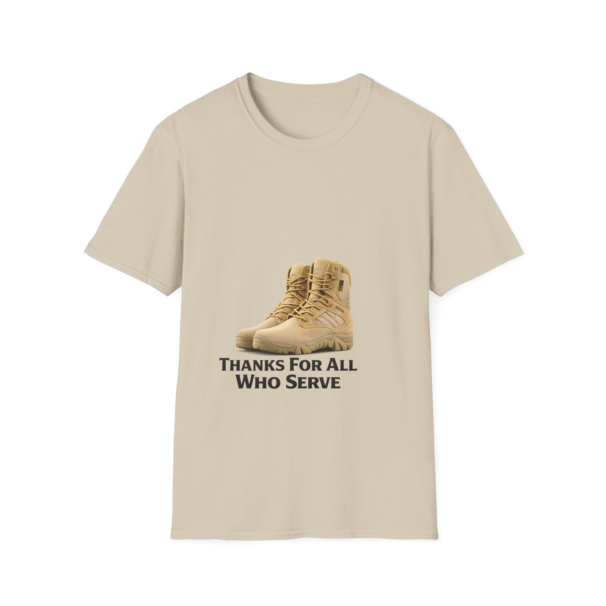 A soft, breathable tee that quietly honors service and sacrifice. The shirt features a realistic pair of desert boots printed above a clean, respectful message: “Thanks For All Who Serve.” Lightweight ring-spun cotton drapes easily, so the design sits naturally at chest level and reads plainly without shouting. Wear it to community gatherings, memorial walks, or everyday errands to show steady support—comfortable enough for all-day wear, durable enough to keep its shape and print through many washes. The neutral white base keeps the focus on the artwork while pairing easily with jeans, jackets, or layered looks.