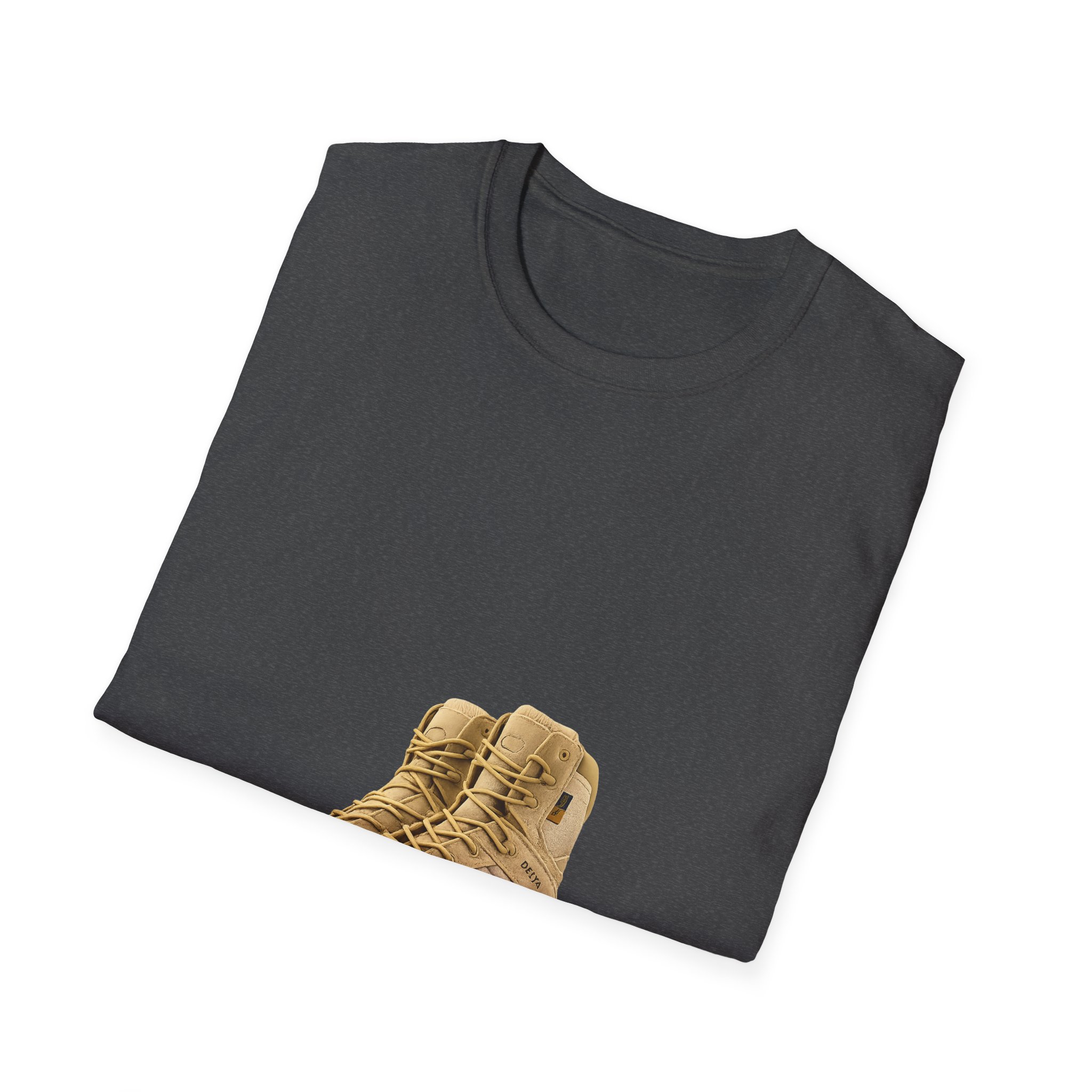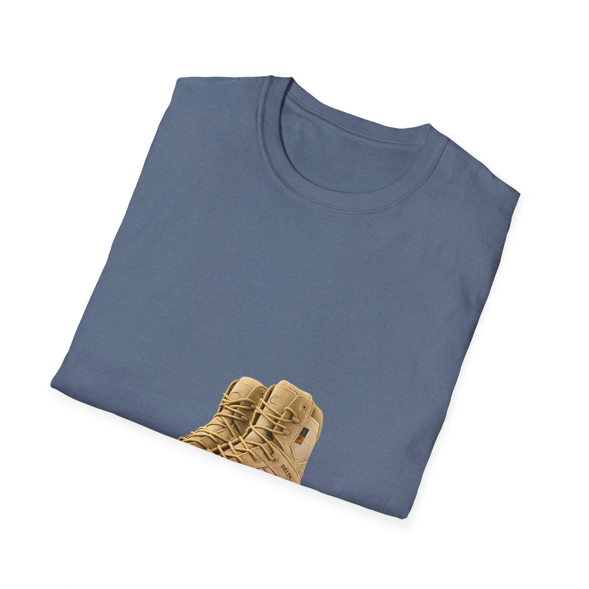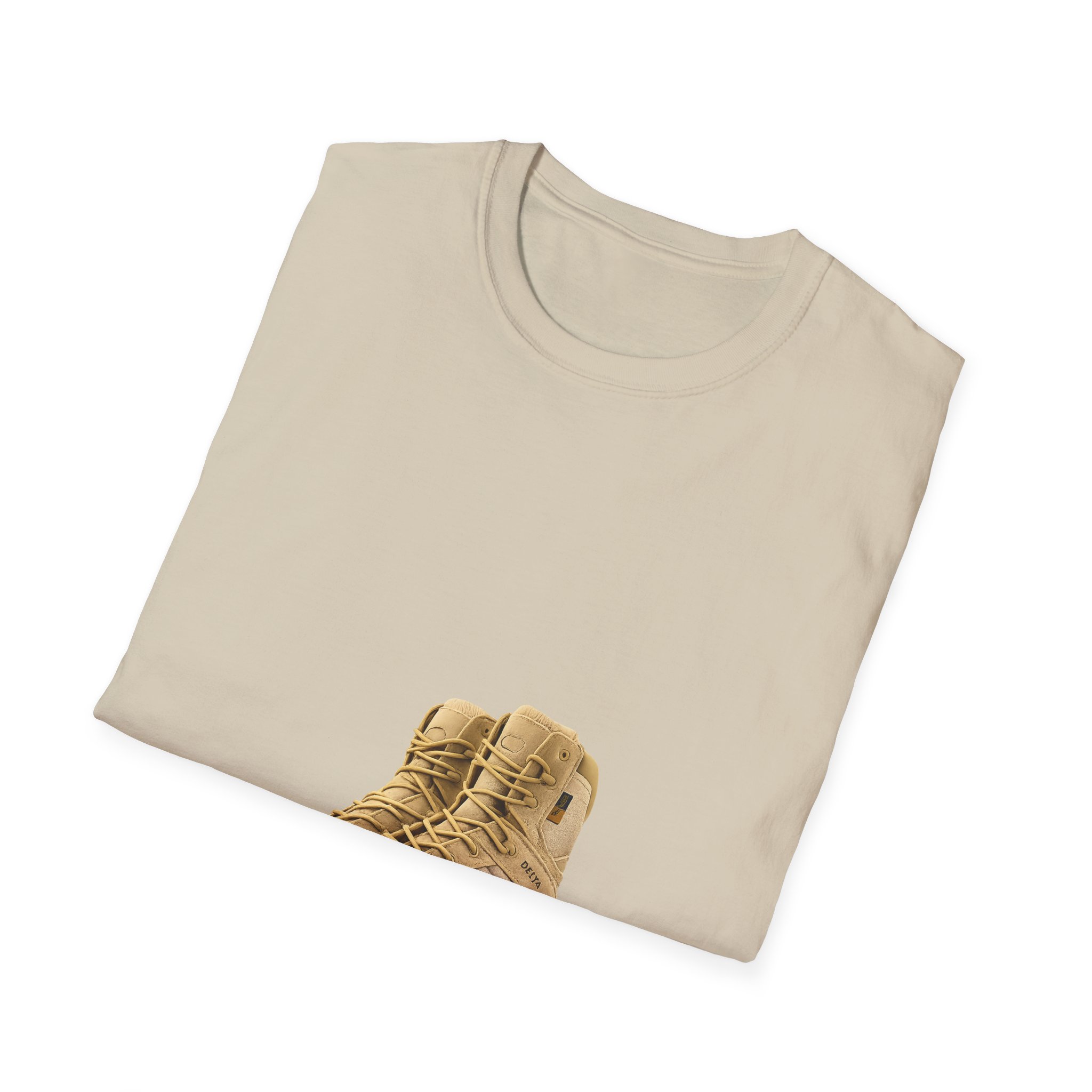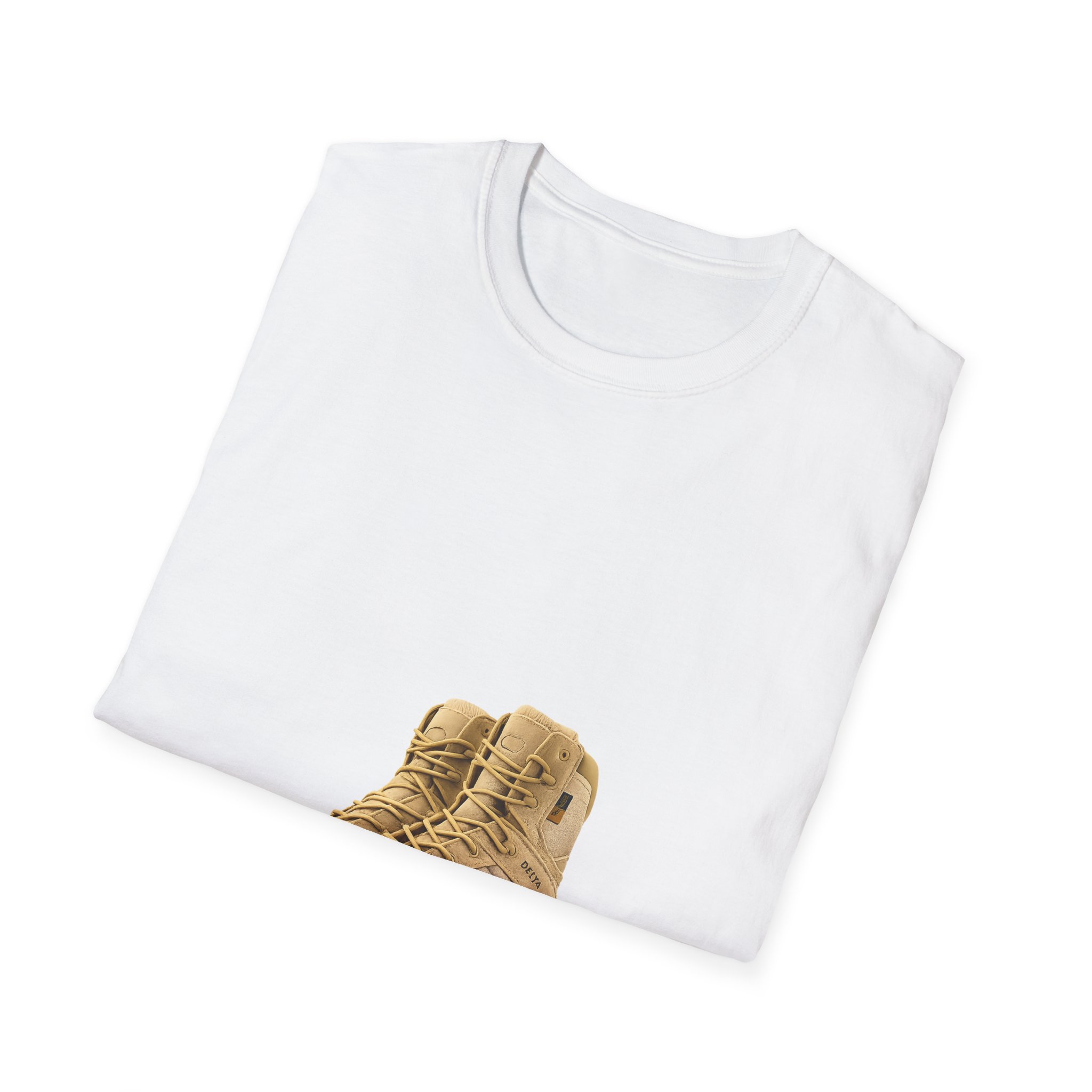 A soft, breathable tee that quietly honors service and sacrifice. The shirt features a realistic pair of desert boots printed above a clean, respectful message: “Thanks For All Who Serve.” Lightweight ring-spun cotton drapes easily, so the design sits naturally at chest level and reads plainly without shouting. Wear it to community gatherings, memorial walks, or everyday errands to show steady support—comfortable enough for all-day wear, durable enough to keep its shape and print through many washes. The neutral white base keeps the focus on the artwork while pairing easily with jeans, jackets, or layered looks.