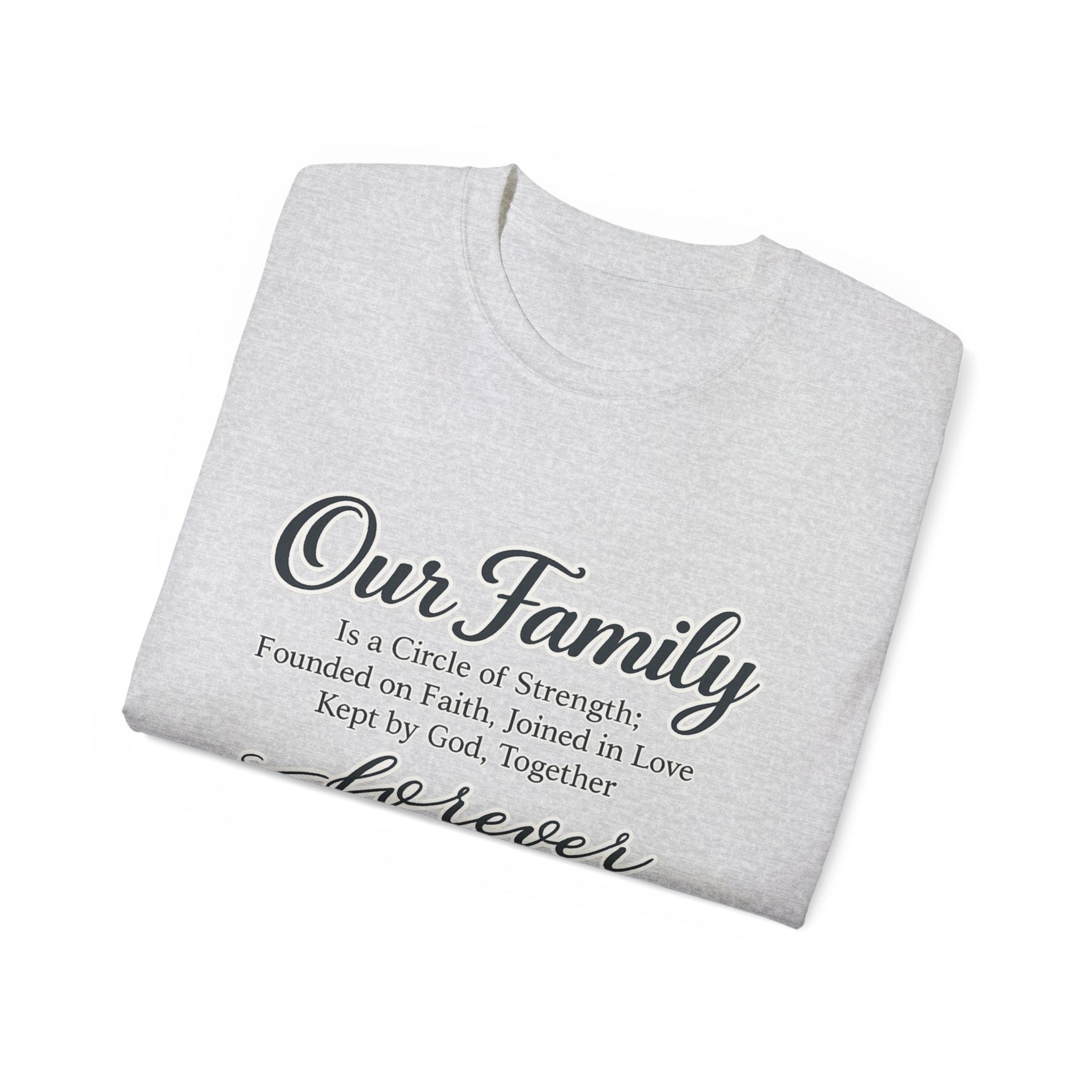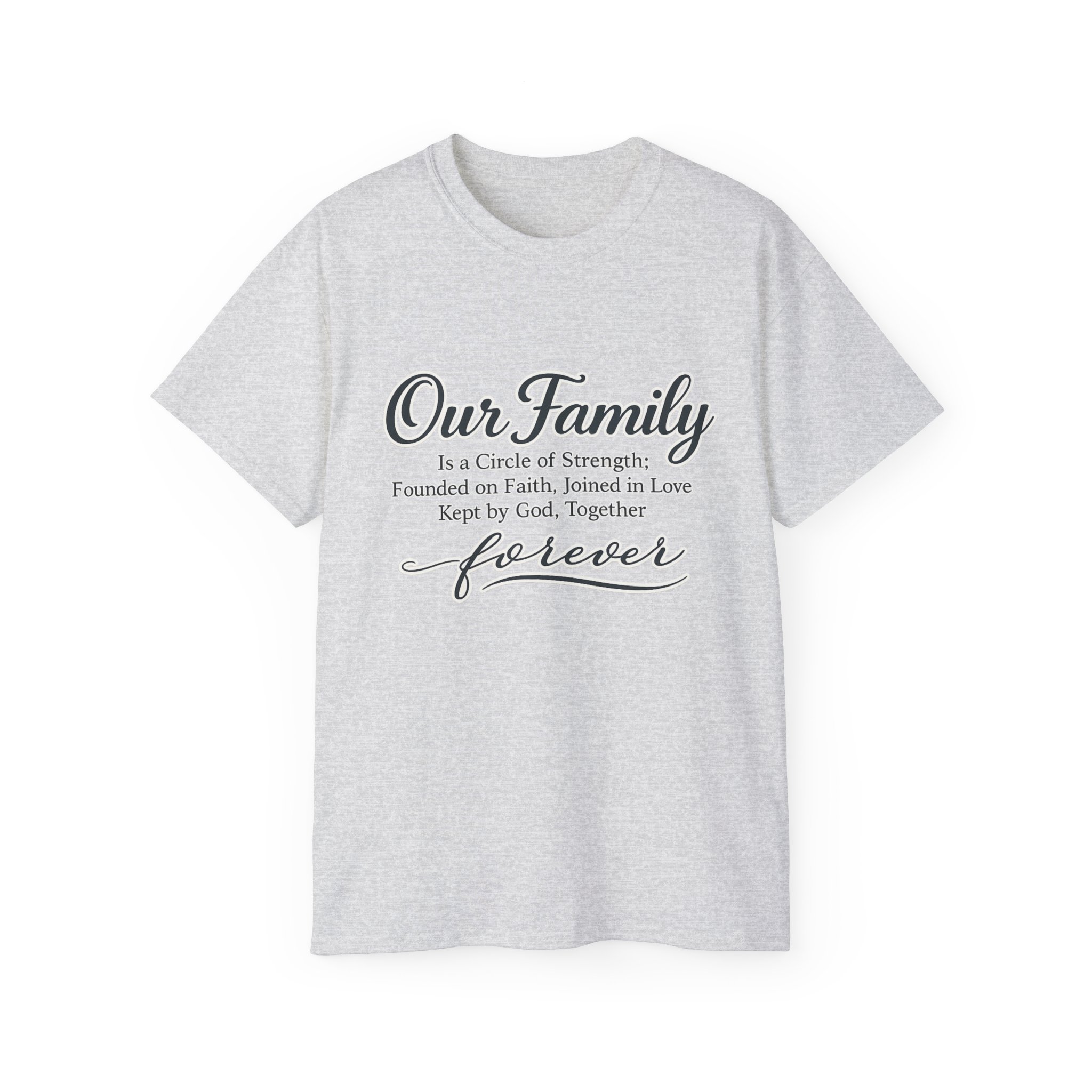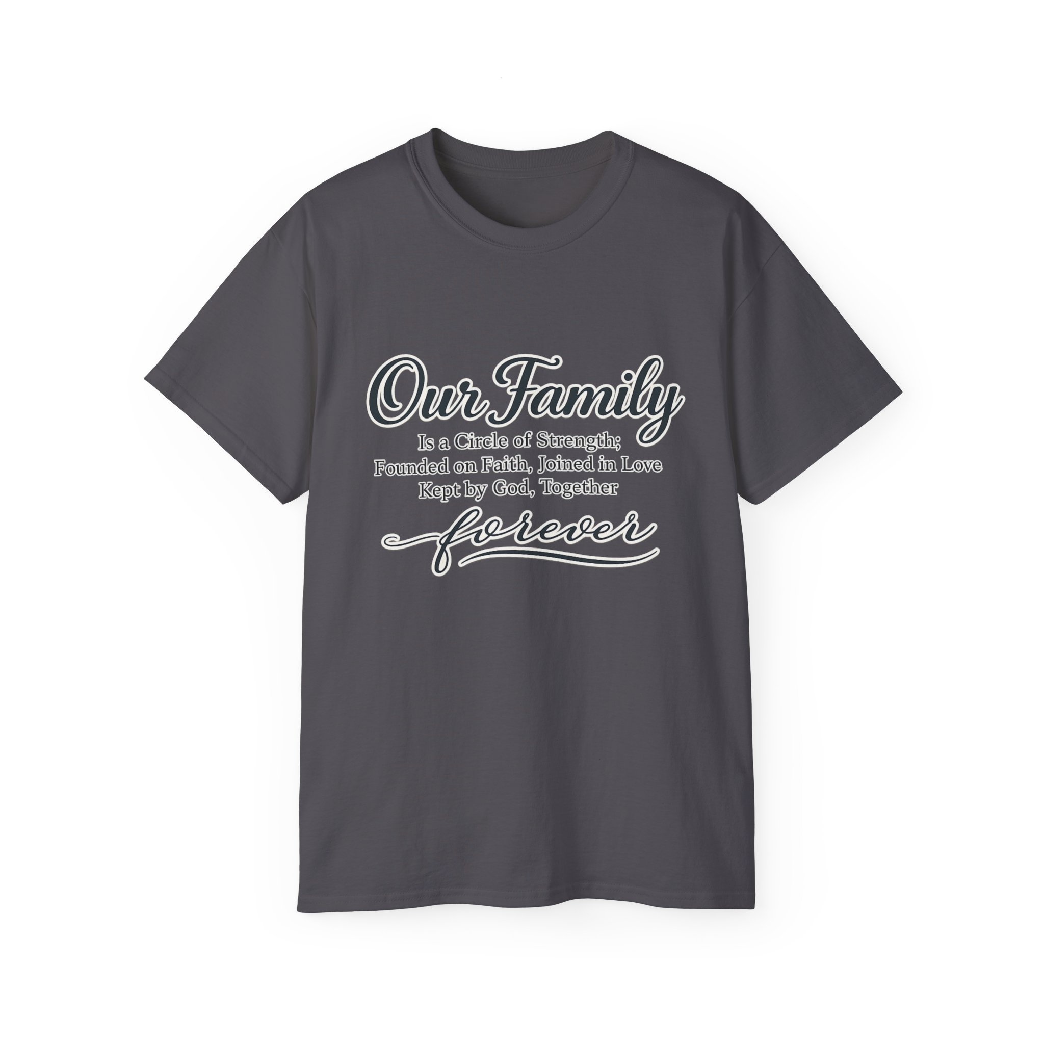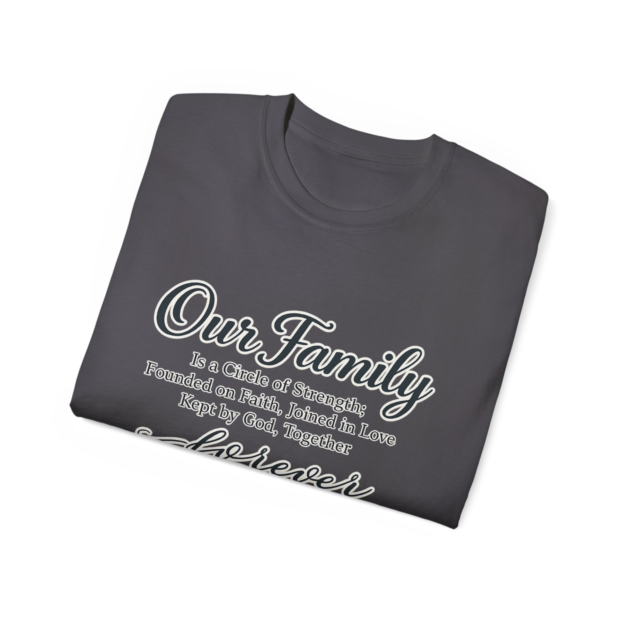 A soft, midweight cotton tee that carries a quiet, heartfelt message: family ties and cherished memories. The front features an elegant script reading “Our Family” with a short, reverent sentiment beneath and a gentle flourish of the word “forever.” The back shows a warm collage of family portraits framed like keepsake snapshots — a wearable tribute that feels like a cozy reunion. The tee’s slightly roomy cut and durable, tubular knit give it a lived-in, vintage comfort that settles in with every wash. Ethically grown U.S. cotton, ribbed collar that holds its shape, and a tear-away label keep the focus on comfort and sentiment. Wear it at casual gatherings, memorials, or family reunions to keep the people you love close at heart.