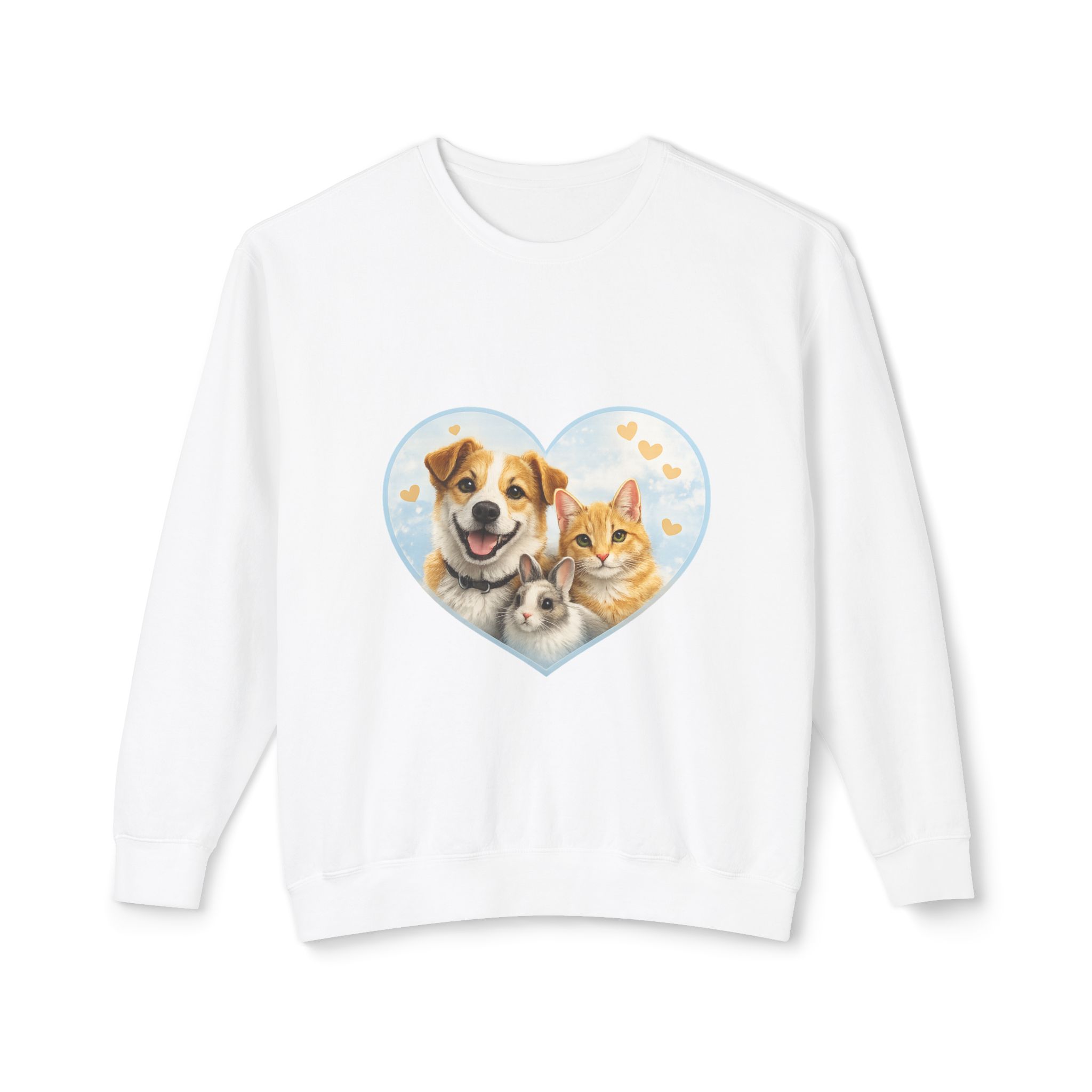Soft, light, and quietly cheerful — this cozy crewneck brings the warmth of a peaceful morning with furry friends right into your day. A gentle heart-shaped illustration of a dog, a cat, and a rabbit sits center chest, surrounded by tiny flying hearts and a pale sky. The relaxed silhouette and breathable ring-spun cotton make it easy to layer over a tee or wear alone while walking the neighborhood, running errands, or lounging at home with your own pet by your side. It’s the kind of sweatshirt that feels like a small, steady hug — familiar, calm, and quietly joyful.