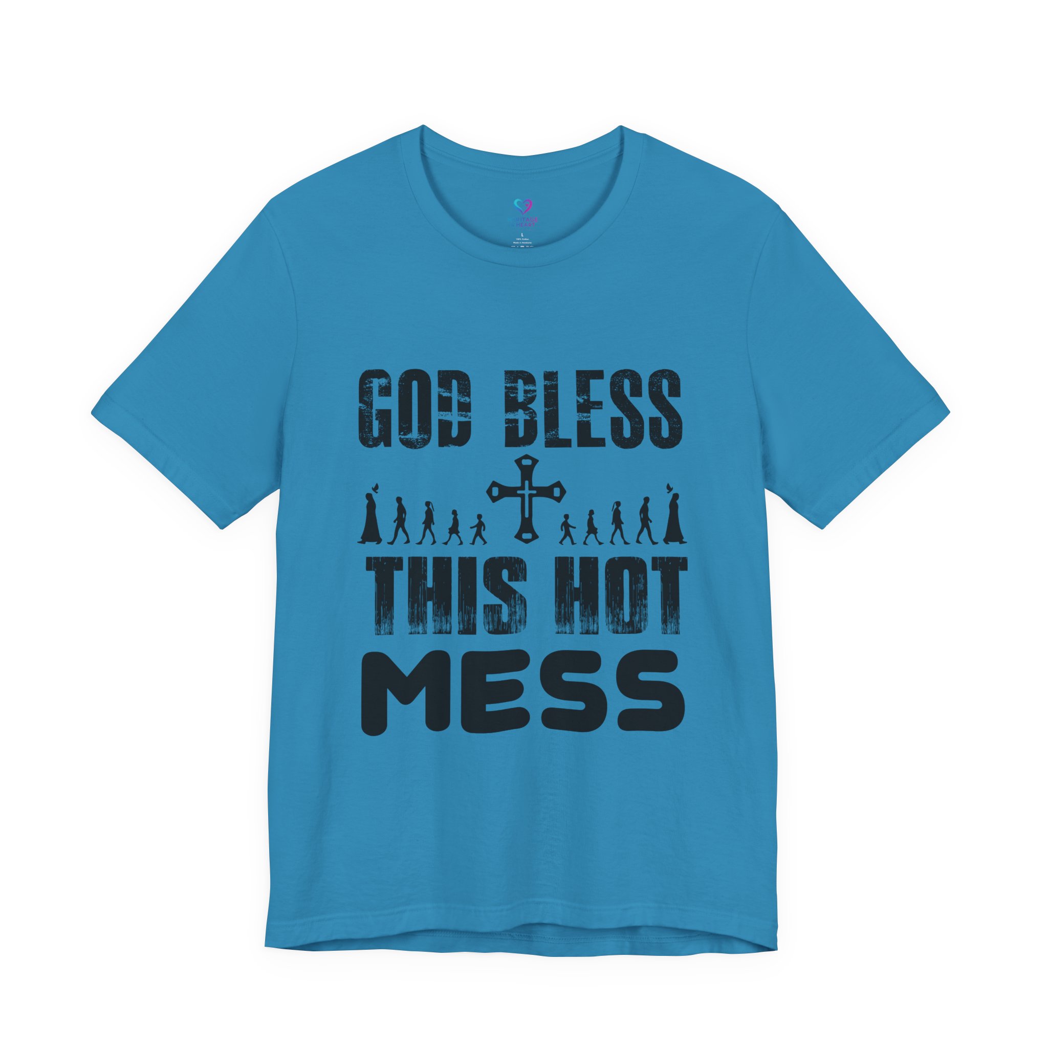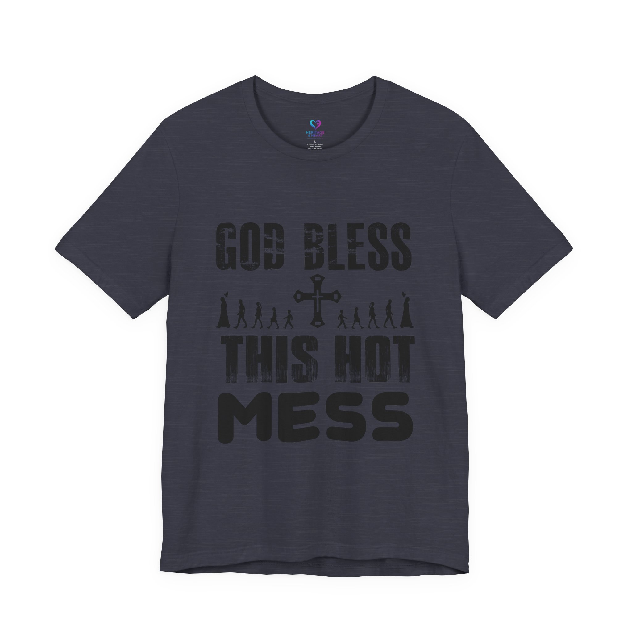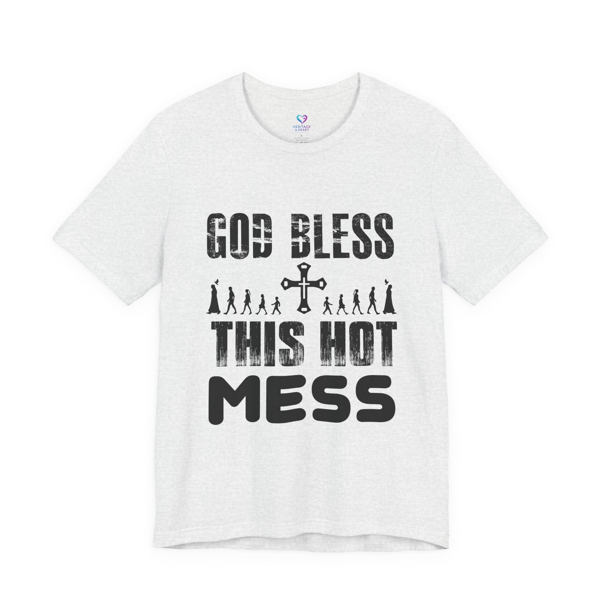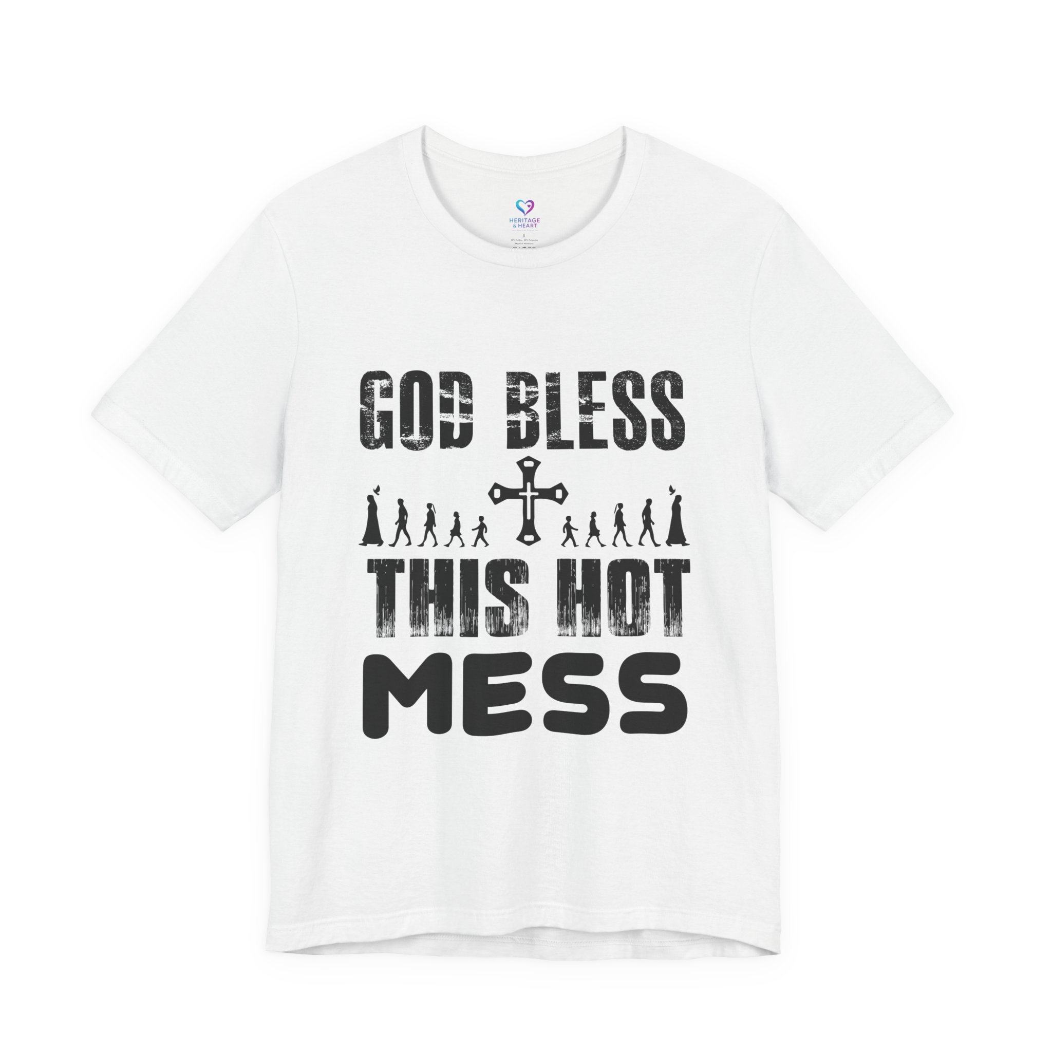 Lightweight, breathable tee with bold, playful typography that reads “God Bless This Hot Mess.” The clean white canvas and distressed black print give it a casual, lived-in look — comfortable for everyday wear and easy to layer. The message lands with humor and honesty, making it a standout piece for relaxed gatherings, weekend errands, or low-key church events where a little self-deprecating wit goes a long way. Soft on the skin and built to keep shape, this shirt wears like an old favorite from the first wash.