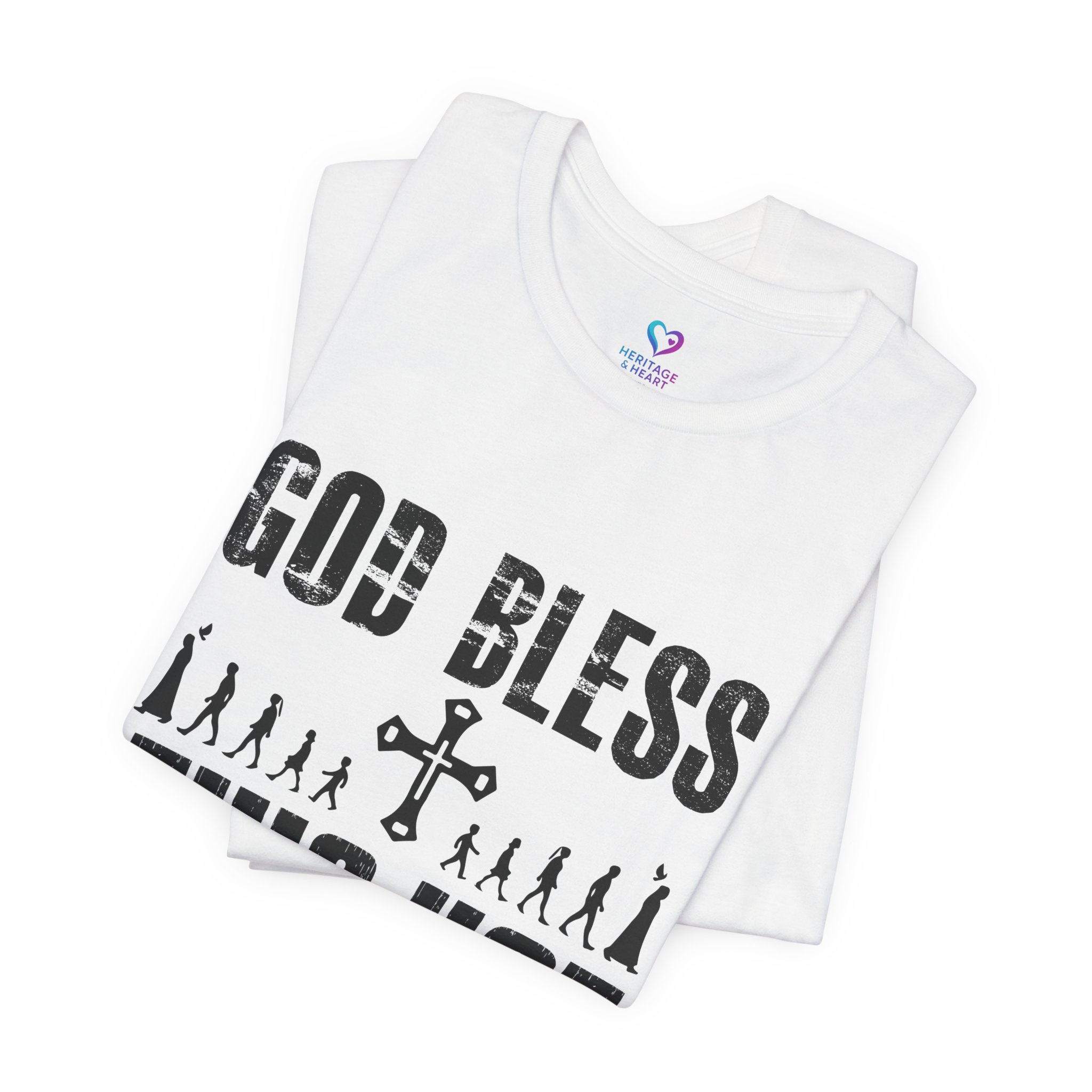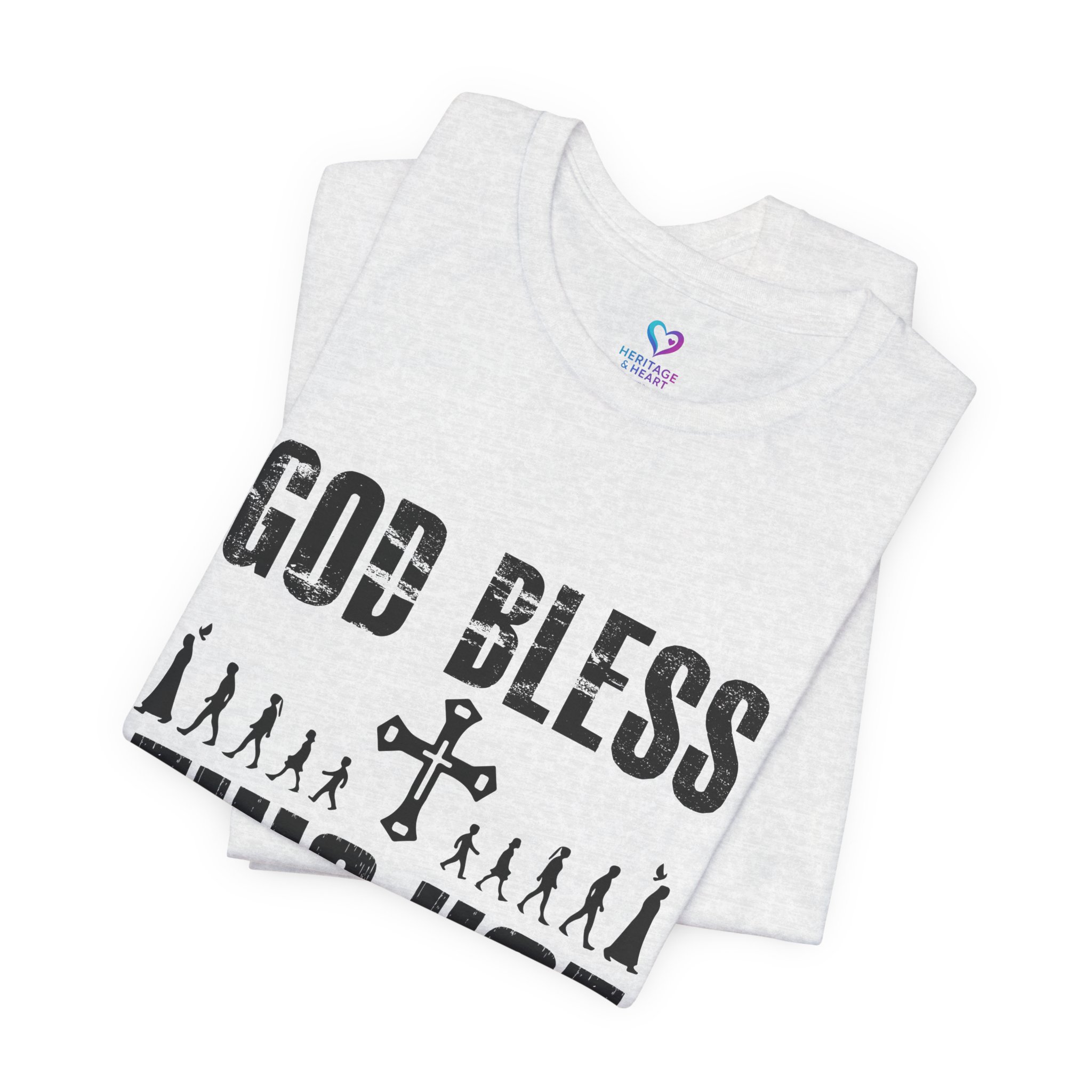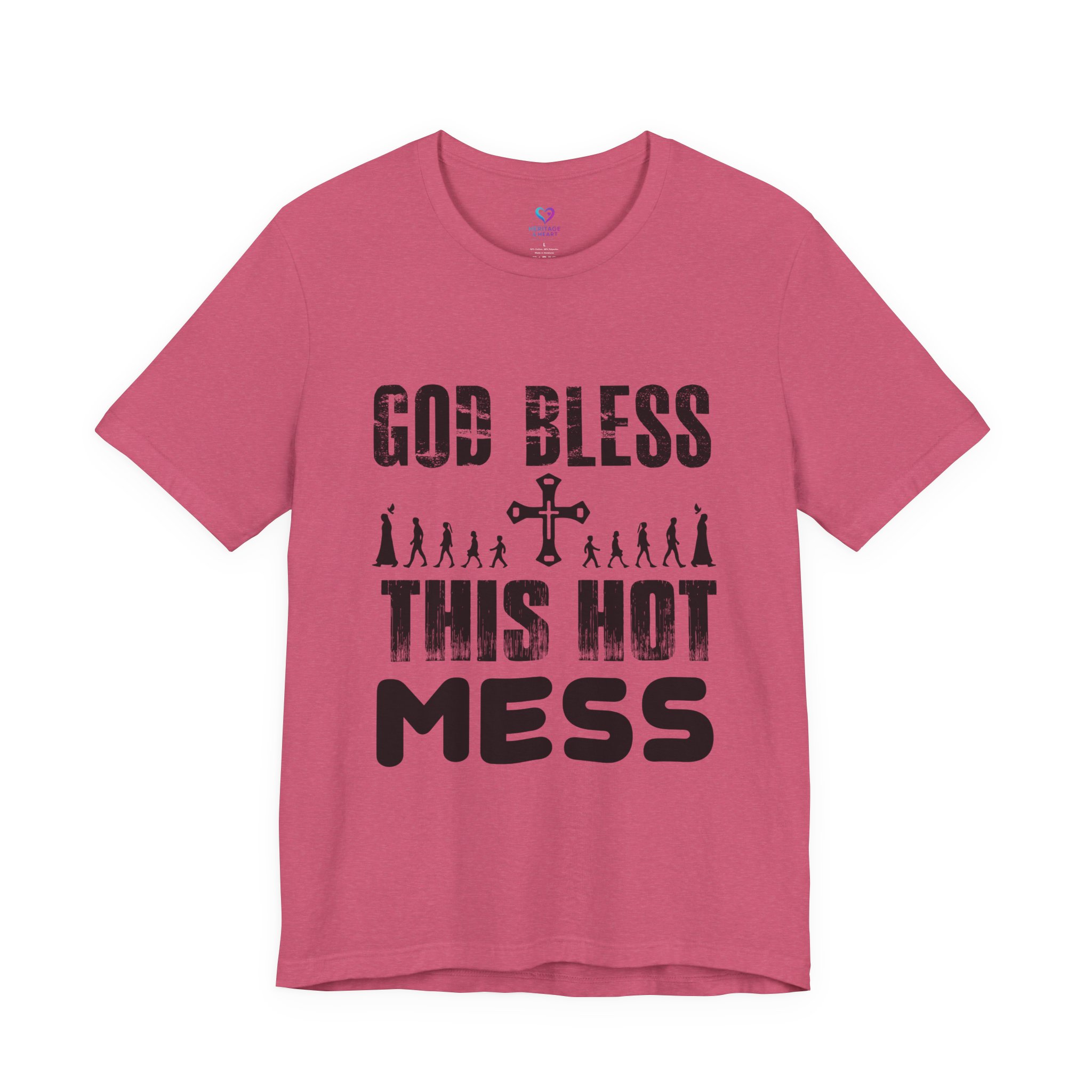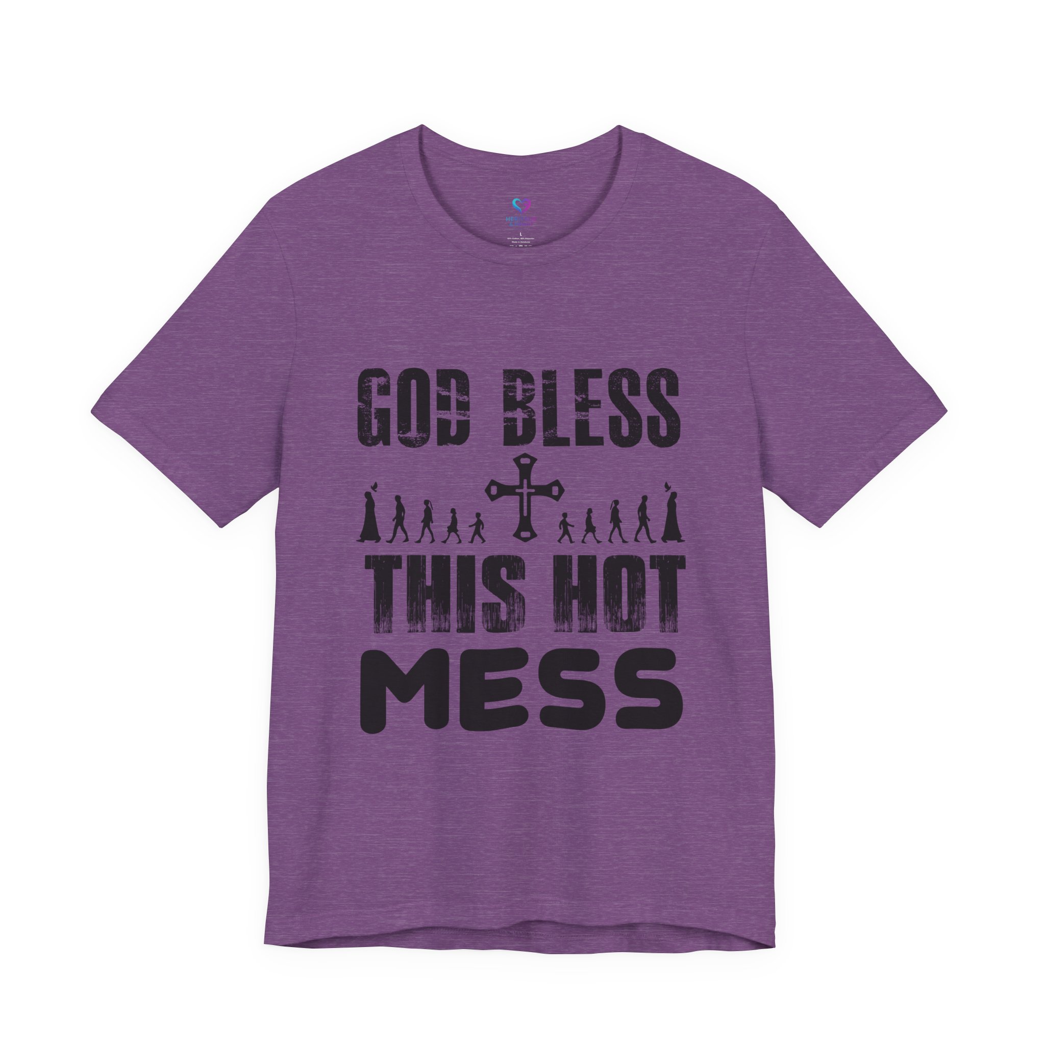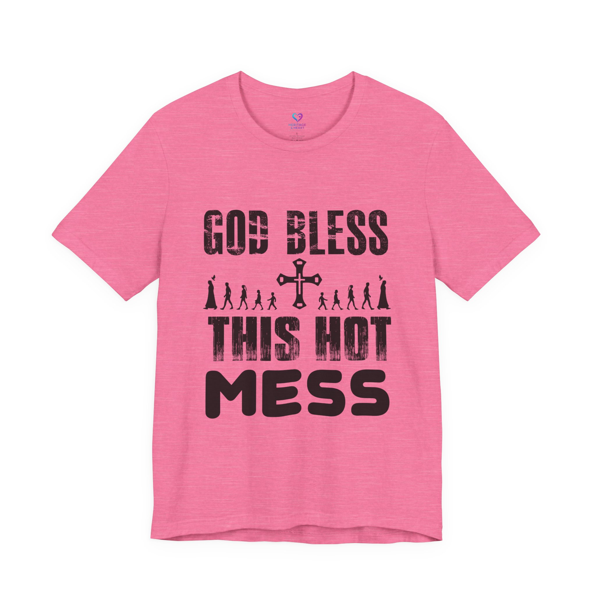 Lightweight, breathable tee with bold, playful typography that reads “God Bless This Hot Mess.” The clean white canvas and distressed black print give it a casual, lived-in look — comfortable for everyday wear and easy to layer. The message lands with humor and honesty, making it a standout piece for relaxed gatherings, weekend errands, or low-key church events where a little self-deprecating wit goes a long way. Soft on the skin and built to keep shape, this shirt wears like an old favorite from the first wash.