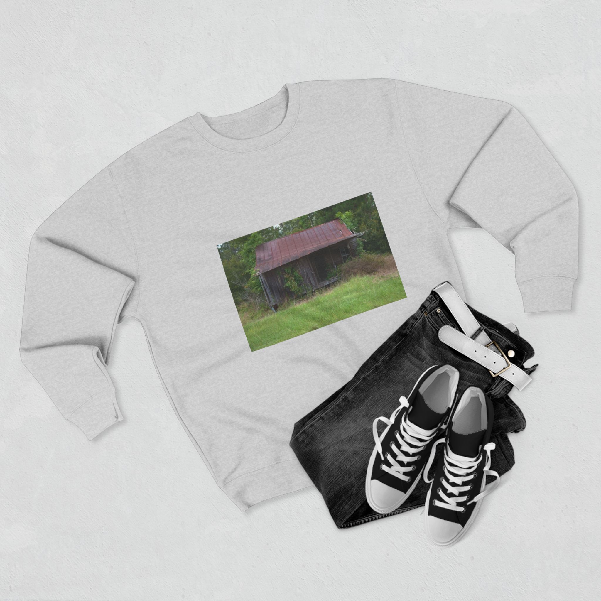 Vintage Cabin Crewneck Sweatshirt — Rustic Old Shed Photo Pullover